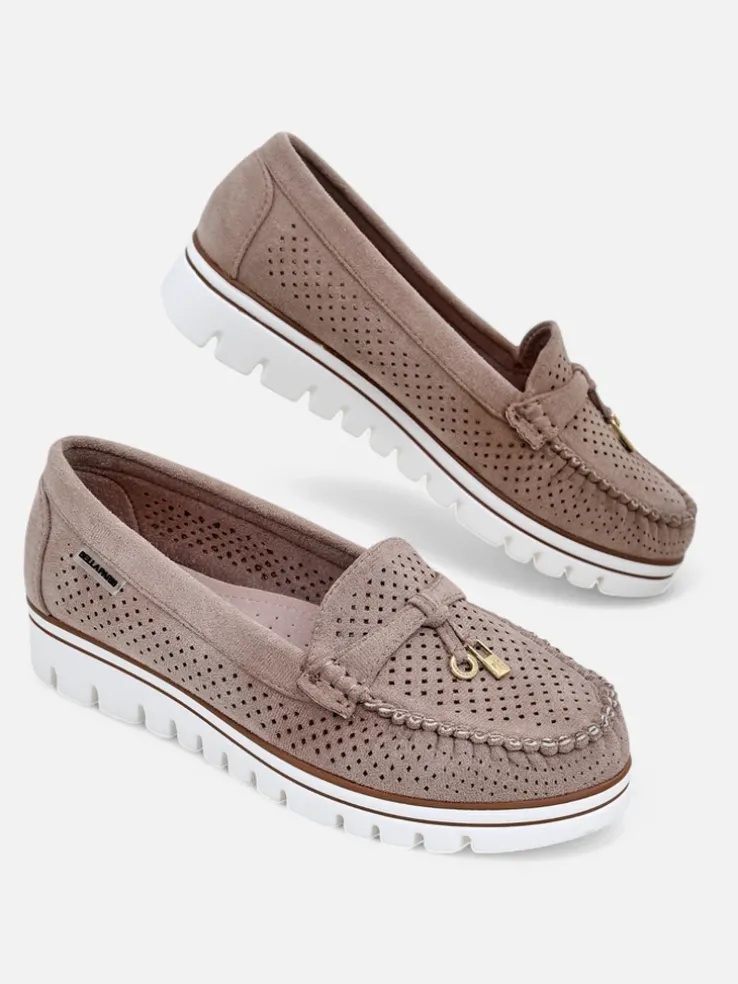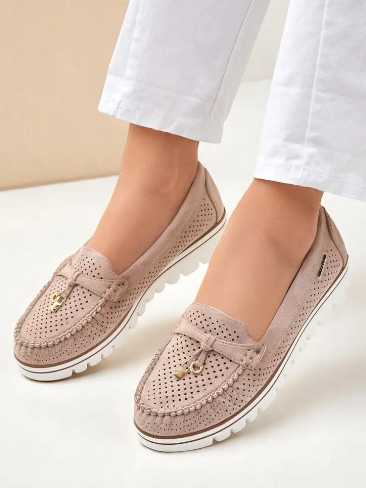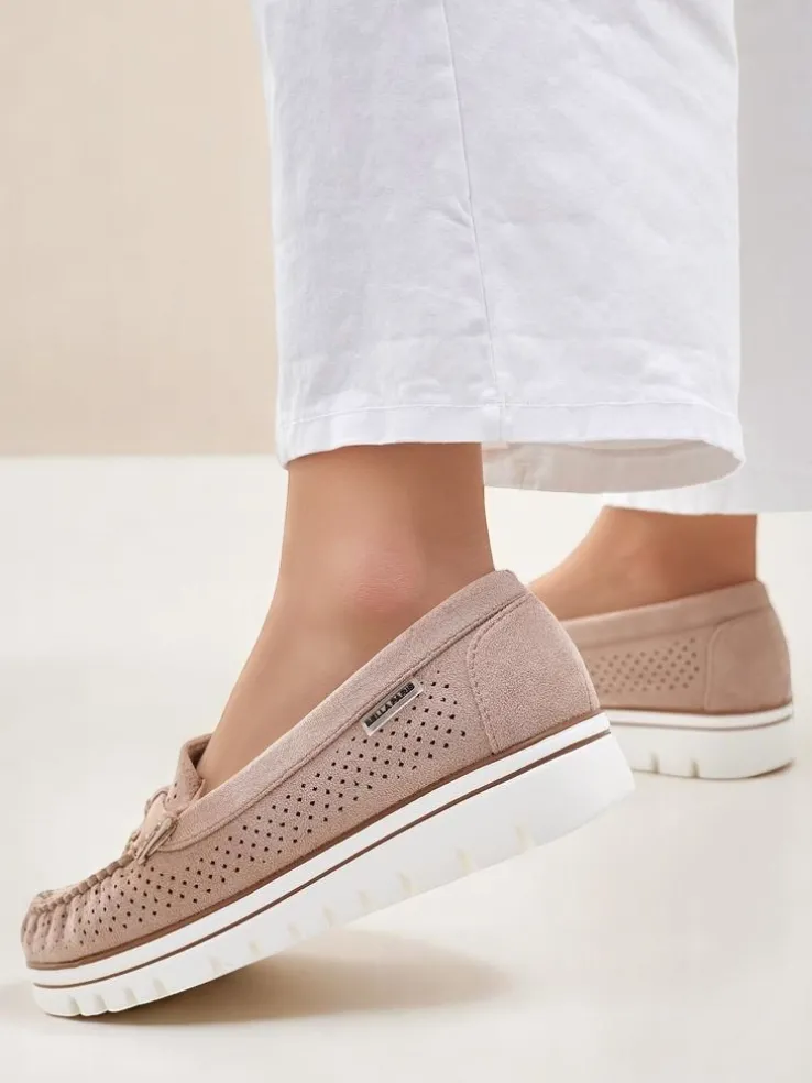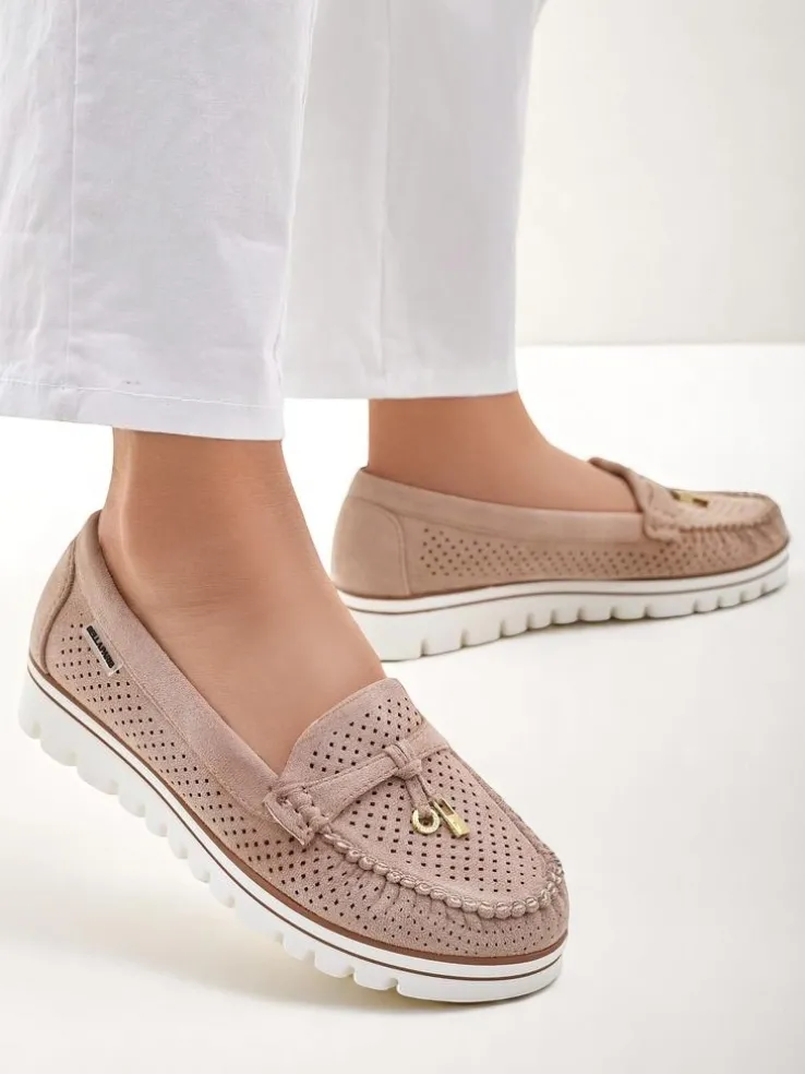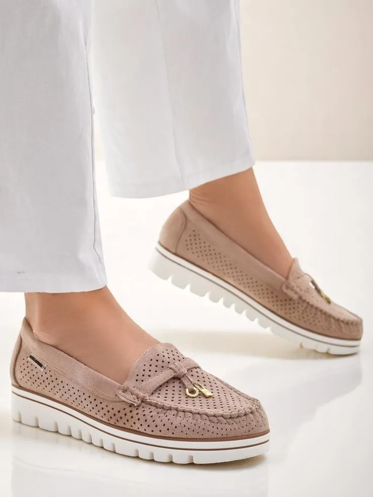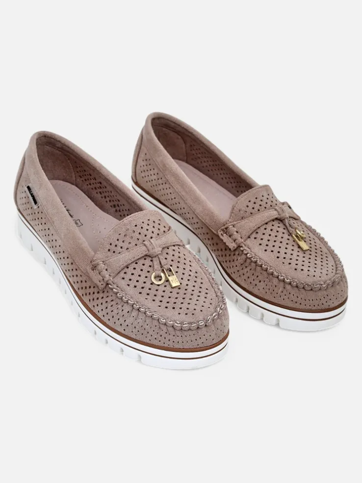 - Lekkie, damskie mokasyny na płaskiej podeszwie. Model w stylu casual i jest wykonany ze skóry ekologicznej zamszowej, wkładka to skóra naturalna. Idealne do wiosennych outfitów!.