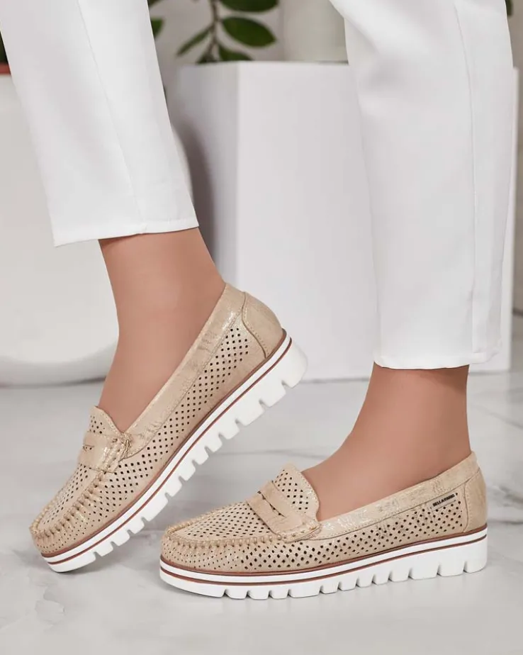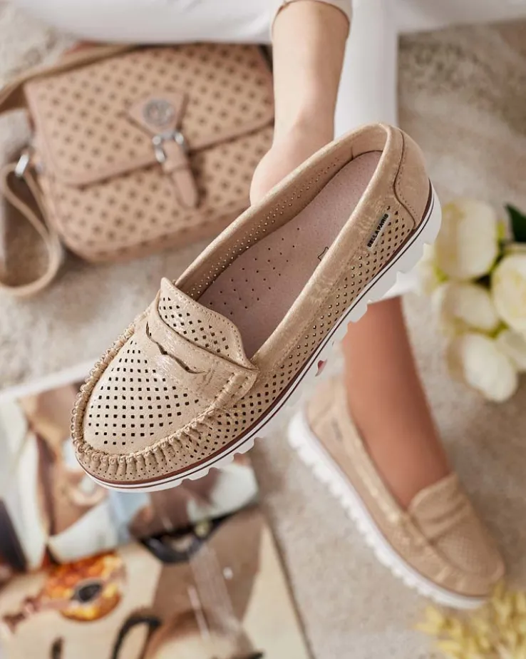 - Ażurowe damskie mokasyny na płaskiej podeszwie. Model jest wykonany ze skóry ekologicznej. W środku wkładka ze skóry naturalnej. Idealna baza na co dzień!