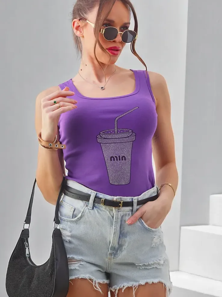 - Casualowa bluzka damska na ramiączkach, która podkreśla kobiecą delikatność. Miękki materiał otula sylwetkę, a okrągły dekolt i nadruk z cyrkonii dodają wyrafinowanego akcentu. Idealna na co dzień jak i specjalne okazje!