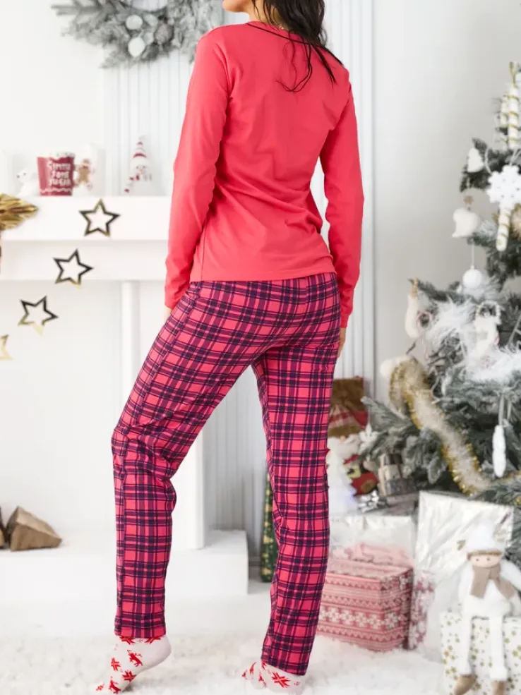 - Damska 2-częściowa piżama wykonana z tkaniny bawełnianej wykończonej ozdobnym printem. Komplet posiada bluzkę z długimi rękawami i guzikami oraz spodnie z gumą w pasie i prostymi nogawkami.