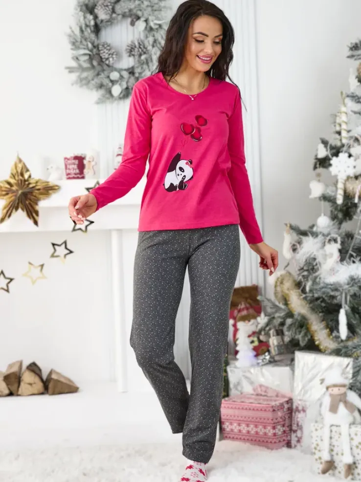 - Damska 2-częściowa piżama wykonana z tkaniny bawełnianej wykończonej ozdobnym printem. Komplet posiada bluzkę z długimi rękawami oraz spodnie z gumą w pasie i prostymi nogawkami.