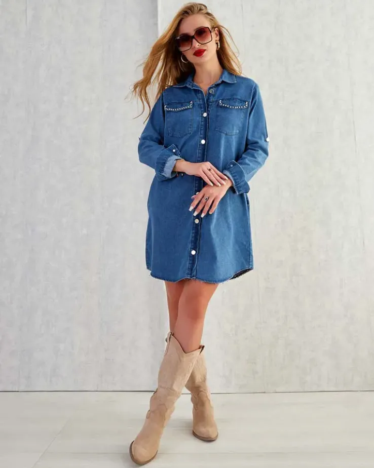 - Sukienka damska mini a’la jeansowa, z długimi, podwijanymi rękawami i kołnierzykiem. Model zapinany na guziki oraz posiada 4 kieszenie. Must have tego sezonu! UWAGA: Dokładność pomiaru (+/-) 1 cm. Wymiary mierzone na płasko.