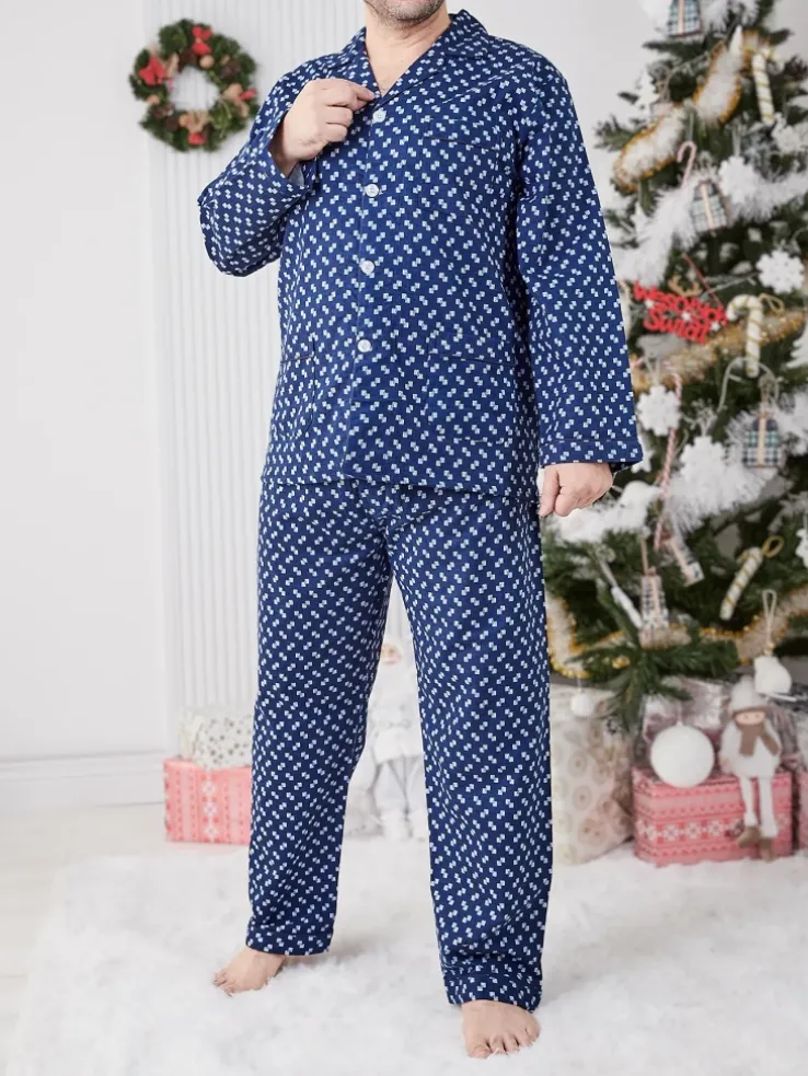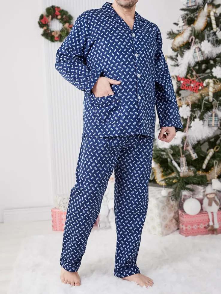 - Piżama męska z modnym printem, wykonana z materiału bawełnianego. Model posiada długie rękawy oraz nogawki. Góra zapinana na guziki. Komfort i elegancja w jednym!