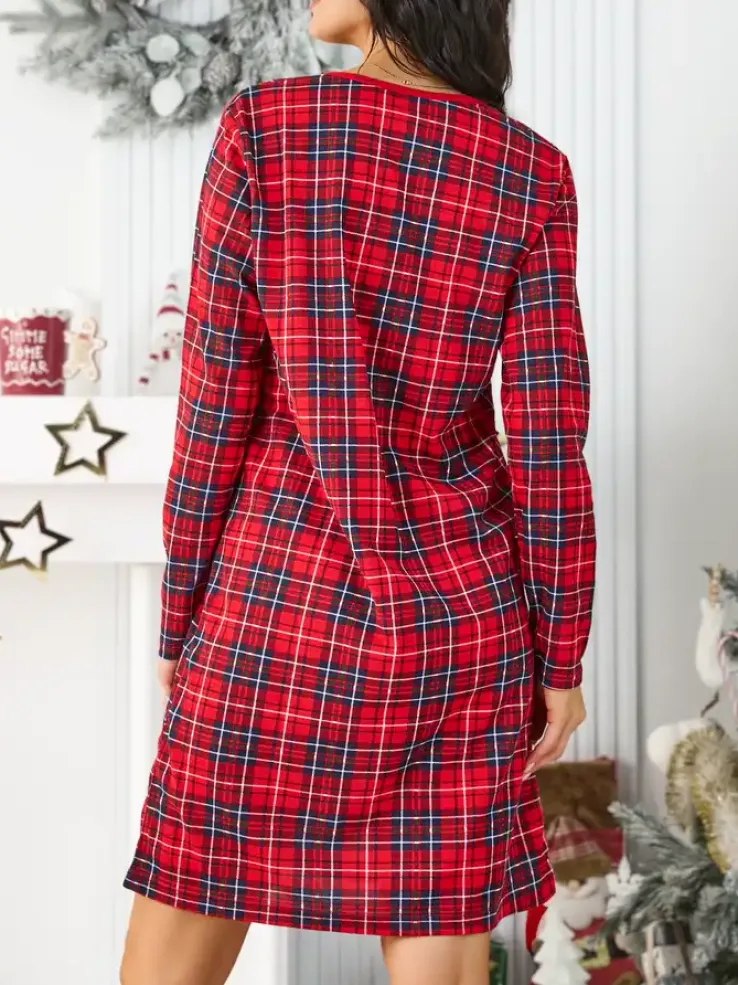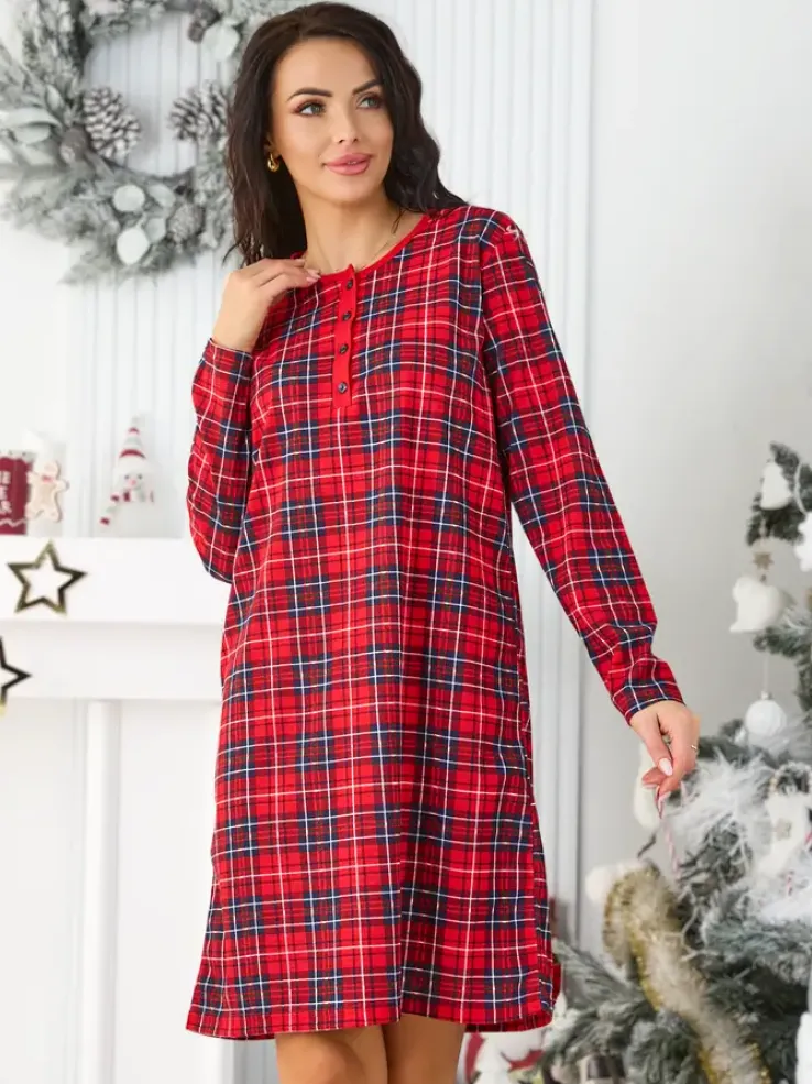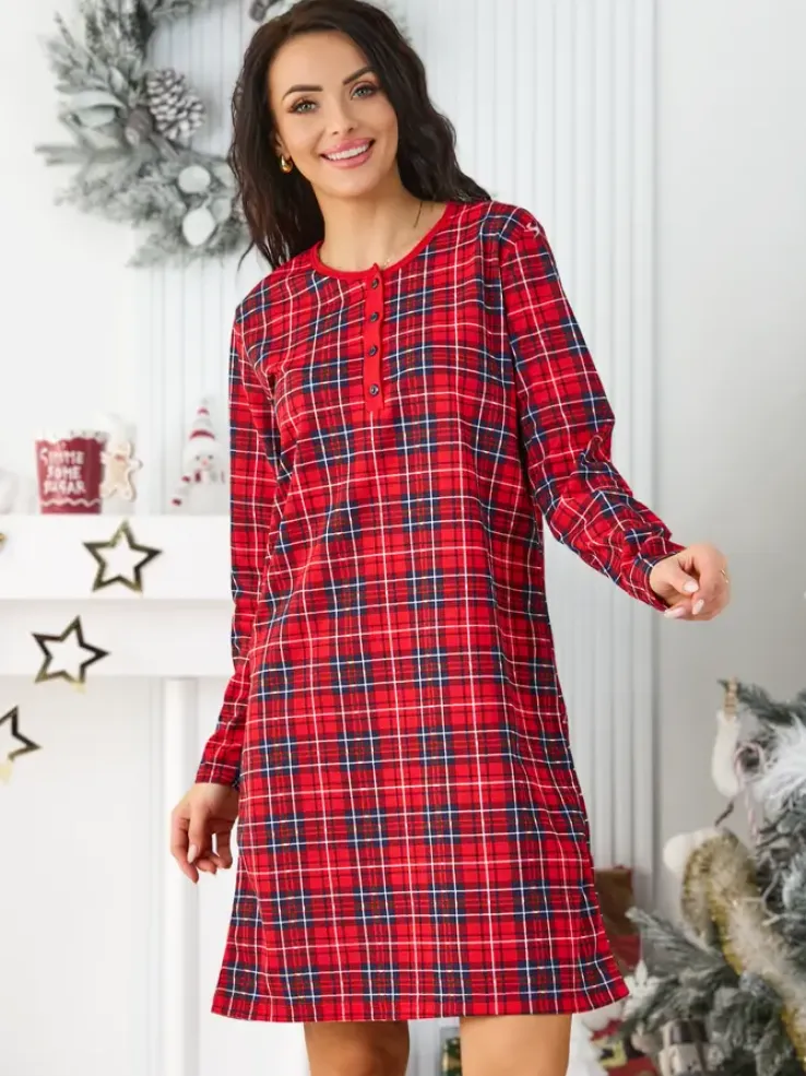 - Damska koszula nocna. Model o lekko rozkloszowanym kroju. Posiada okrągły dekolt i długie rękawy. Jest zdobiona printem w kratę. UWAGA: Dokładność pomiaru (+/-) 1 cm.