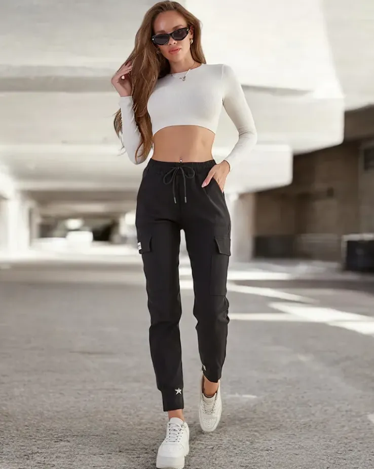 - Wygodne damskie spodnie typu bojówki wykonane z przyjemnej tkaniny. Model posiada 4 kieszenie, w tym też po bokach. Spodnie posiadają gumę i wiązanie w pasie.