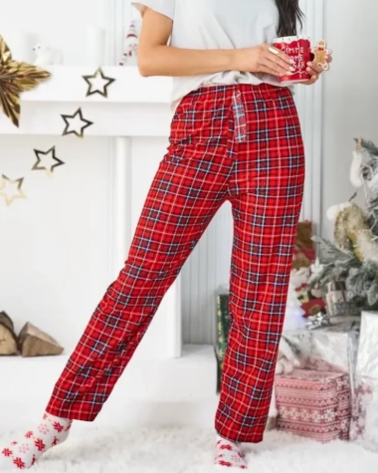 - Damskie spodnie materiałowe, wykonane z miękkiego materiału bawełnianego. Model o prostym kroju, posiada gumę w pasie z troczkami. Idealne na domowe wieczory! UWAGA: Dokładność pomiaru (+/-) 1 cm.