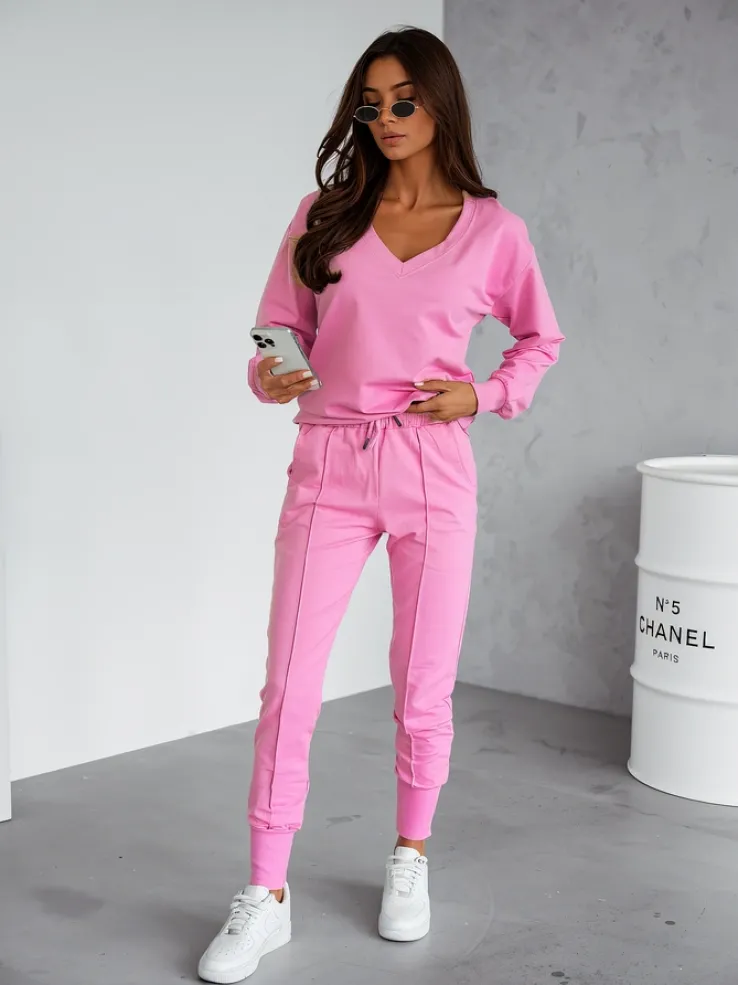 - Damski komplet casualowy wykonany z przyjemnej tkaniny. Bluza zakładana przez głowę, posiada długie rękawy oraz dekolt w serek. Zwężane spodnie z 2 wsuwanymi kieszeniami, gumą i troczkami w pasie. Idealny dla tych, którzy cenią komfort.