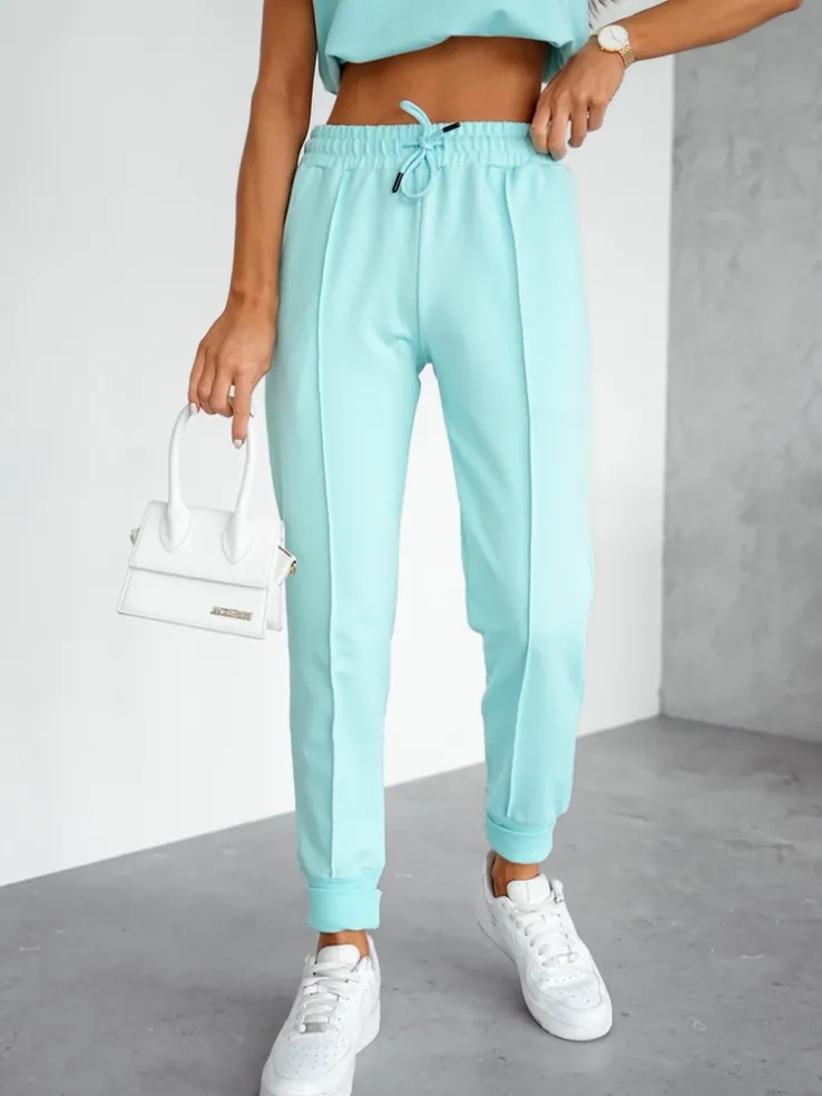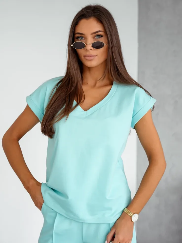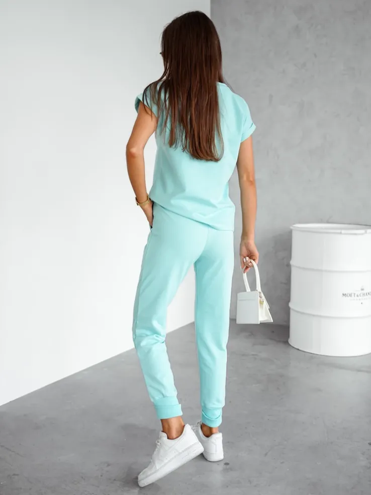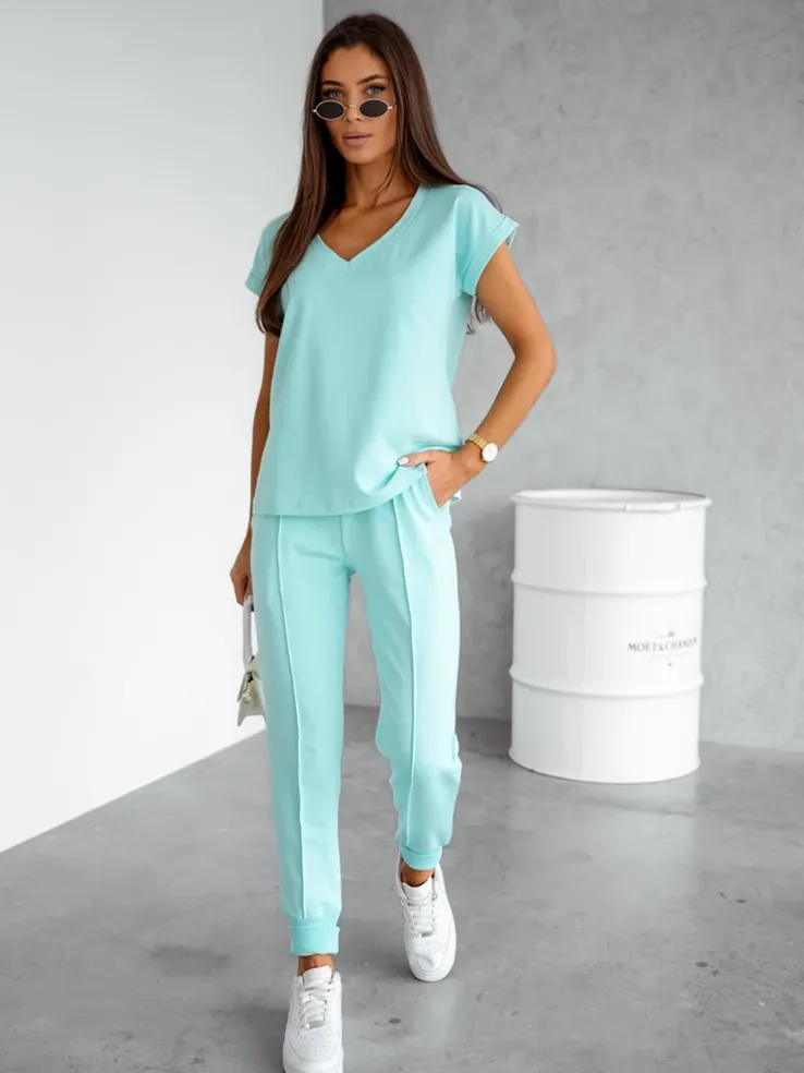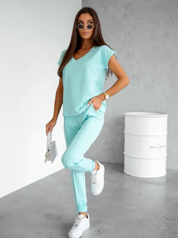 - Damski komplet casualowy wykonany z przyjemnej tkaniny. Bluza zakładana przez głowę, posiada krótkie rękawy oraz dekolt w serek. Zwężane spodnie z 2 wsuwanymi kieszeniami, gumą i troczkami w pasie. Idealny dla tych, którzy cenią komfort.
