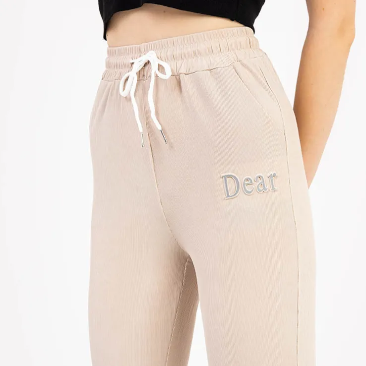 - Damskie spodnie materiałowe z napisem, materiał wykonania to przewiewna tkanina. Spodnie posiadają szeroką gumkę w pasie utrzymującą je we właściwym miejscu oraz na nogawkach. Dodatkowo wiązanie w pasie. UWAGA: Dokładność pomiaru (+/-) 1 cm.