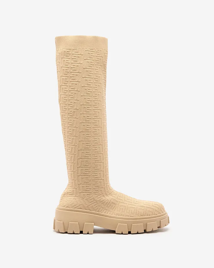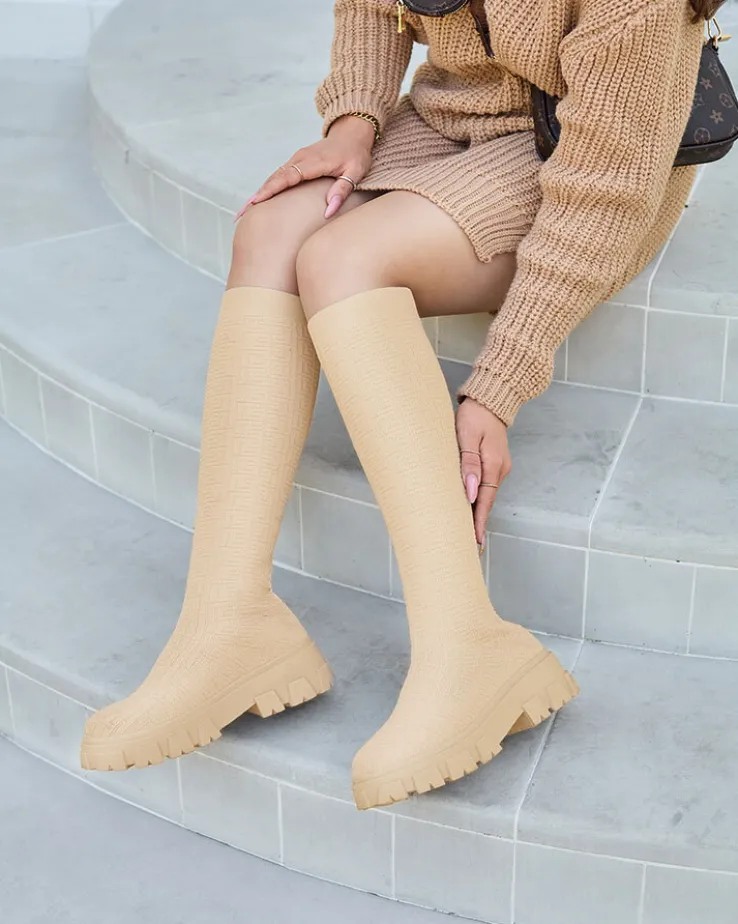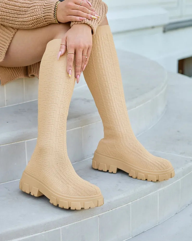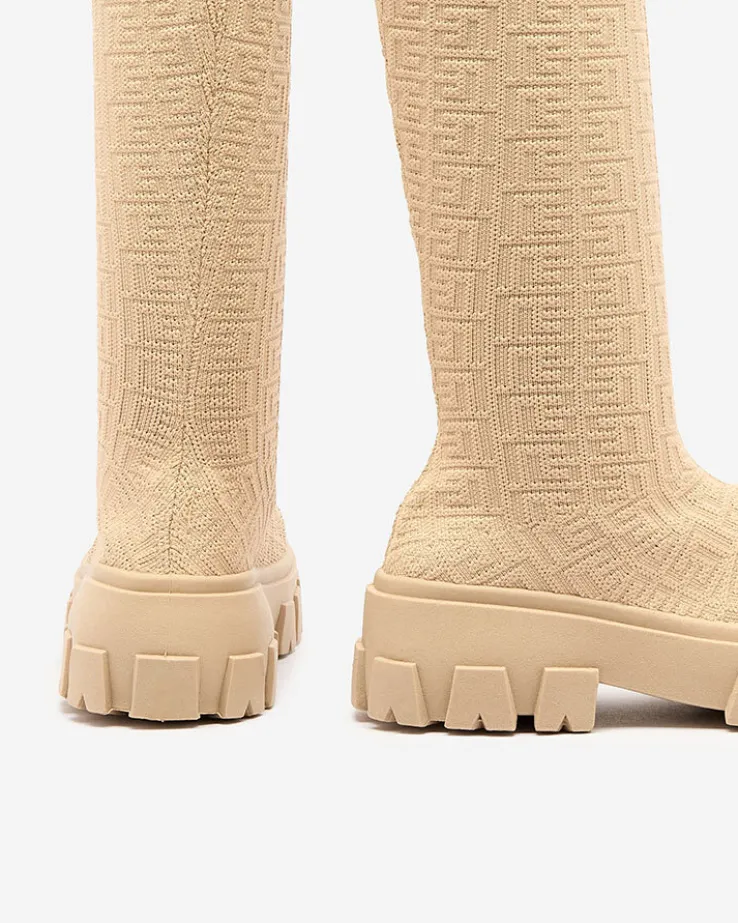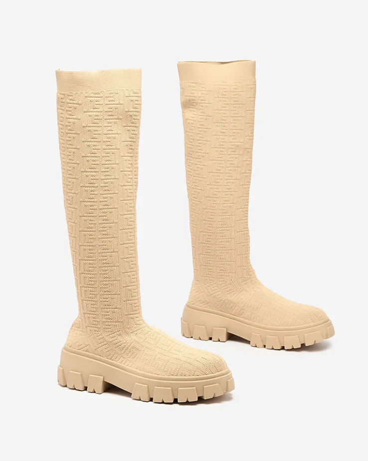 - Wyjątkowe damskie kozaki materiałowe do kolana, model wsuwany i wykonany z elastycznej tkaniny zdobionej ciekawym wzorem, co nadaje im stylu. W środku tkaninowa wkładka. Hit tego sezonu!