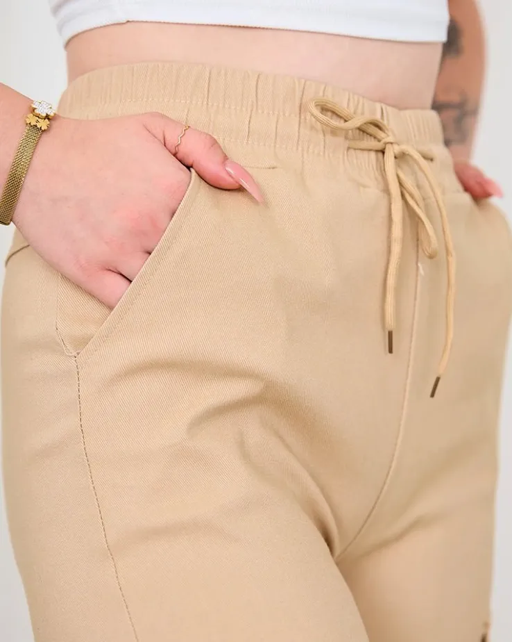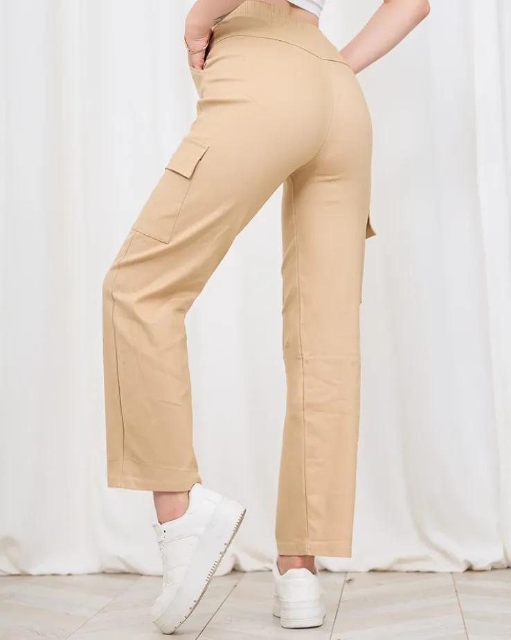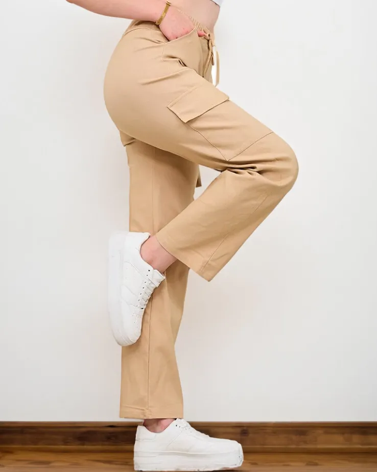 - Szerokie spodnie w stylu cargo to doskonałe połączenie wygody i modnego designu. Spodnie posiadają wiązane troczki oraz elastyczną gumę w pasie, która dodaje komfortu i swobody ruchów. Dodatkowo 4 wsuwane kieszenie na niezbędne drobiazgi.