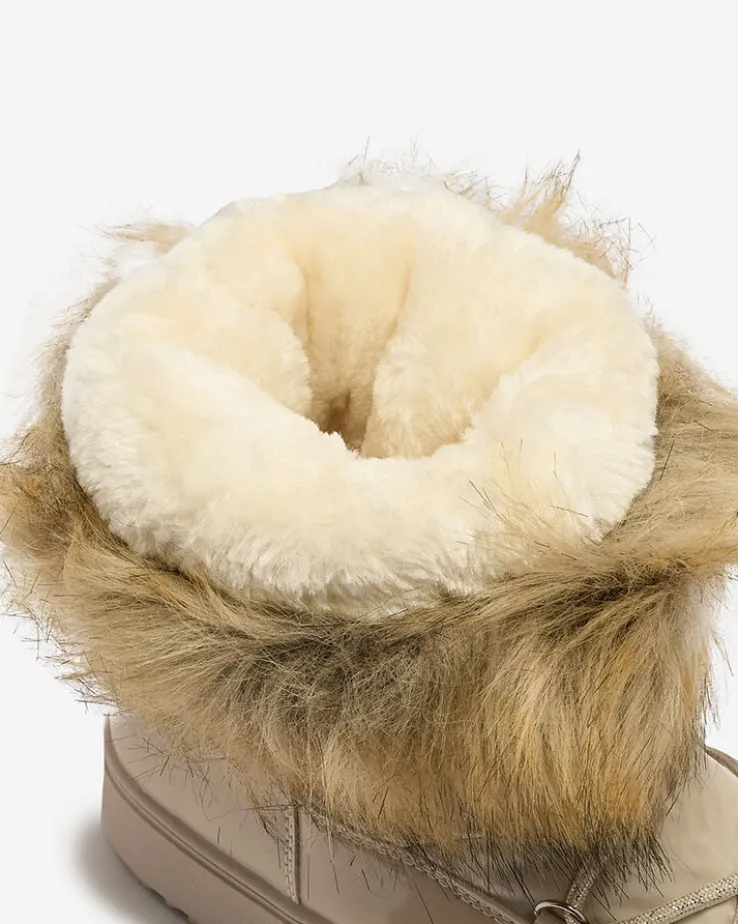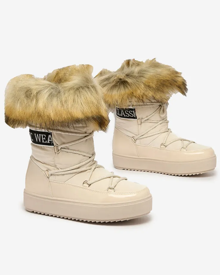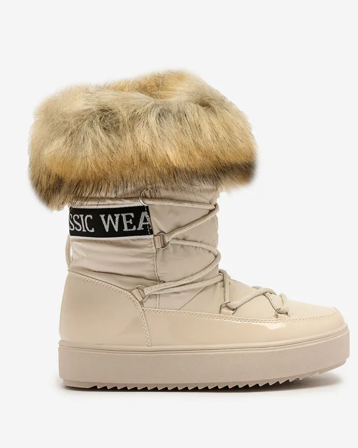 - Damskie obuwie typu śniegowce z cholewką wykonaną z połączenia eko skóry lakierowanej oraz materiału a’la cerata. W środku ocieplenie w formie futerka, obuwie wsuwane. Model posiada futerko przy końcu cholewki. Idealne na zimę!