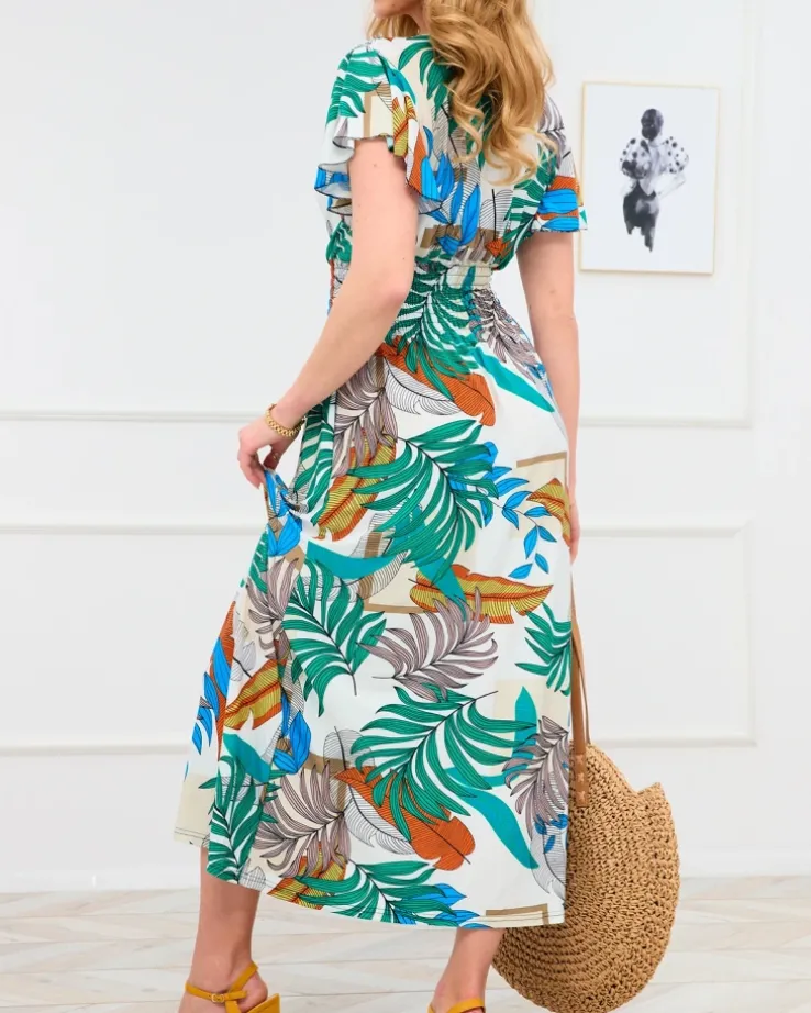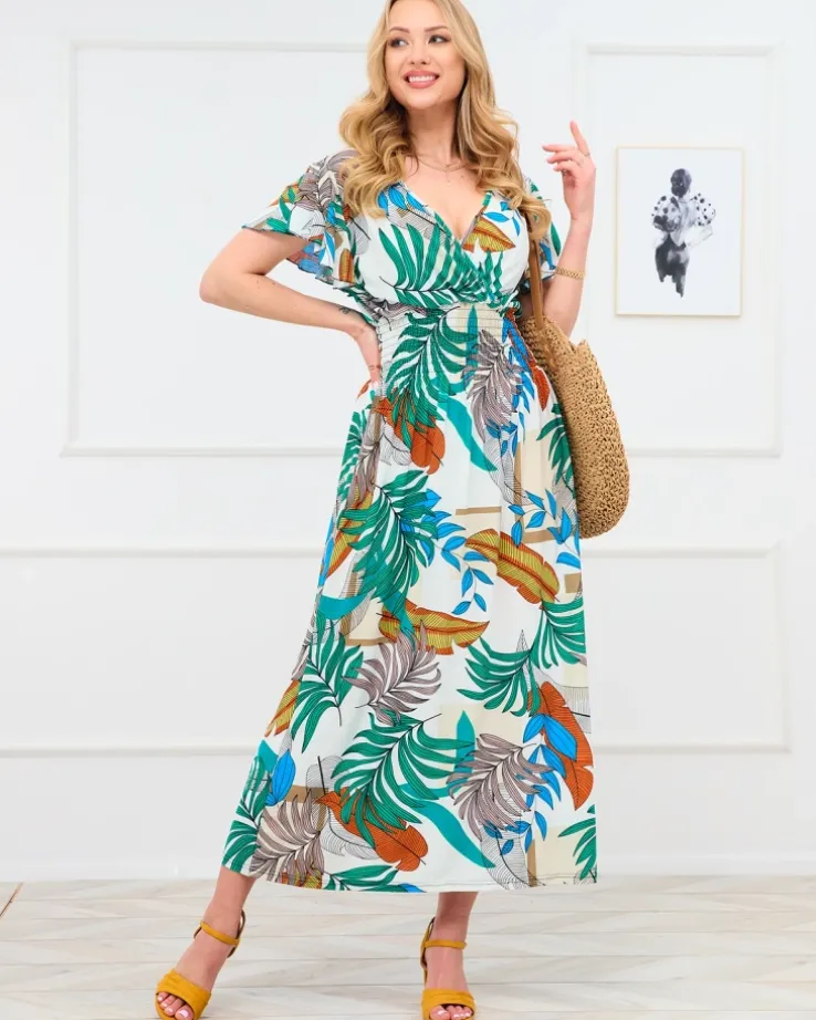 - Damska długa sukienka wykonana ze śliskiej tkaniny z roślinnym wzorem. Model z krótkimi rękawami, posiada kopertowy dekolt i gumę podkreślającą talię. Doskonała sukienka na lato! UWAGA: Dokładność pomiaru (+/-) 1 cm