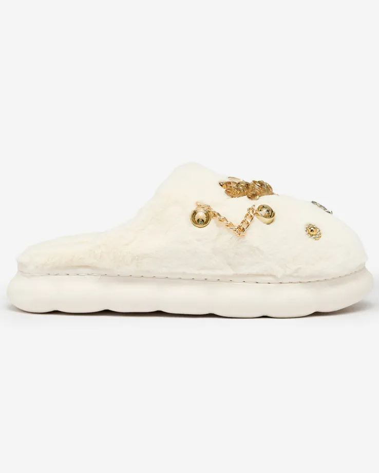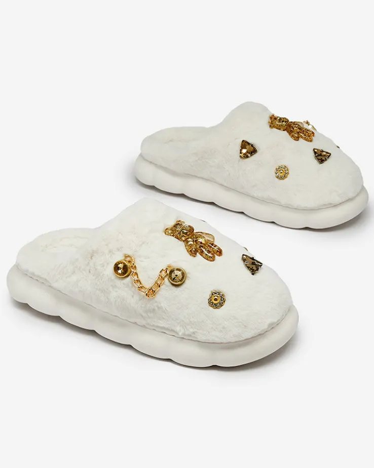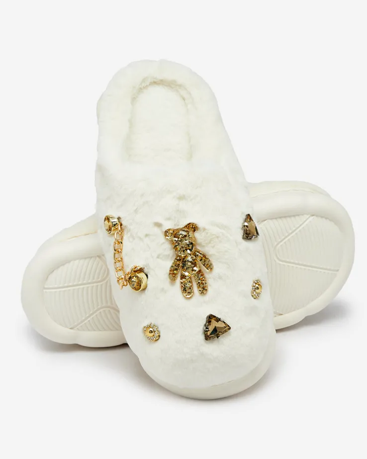 - Rewelacyjne damskie kapcie na płaskiej podeszwie, zdobione łańcuszkami i plastikowymi ozdobami w kształcie misia. Model wykonany z materiału imitującego futerko. Świetna propozycja dla domowych outfitów!