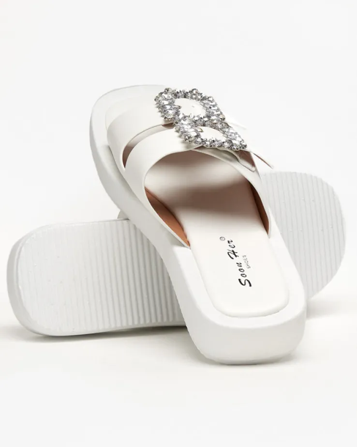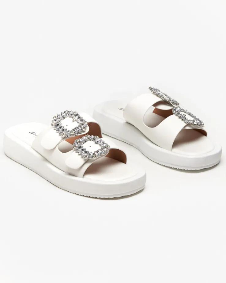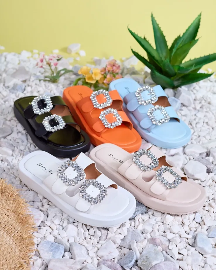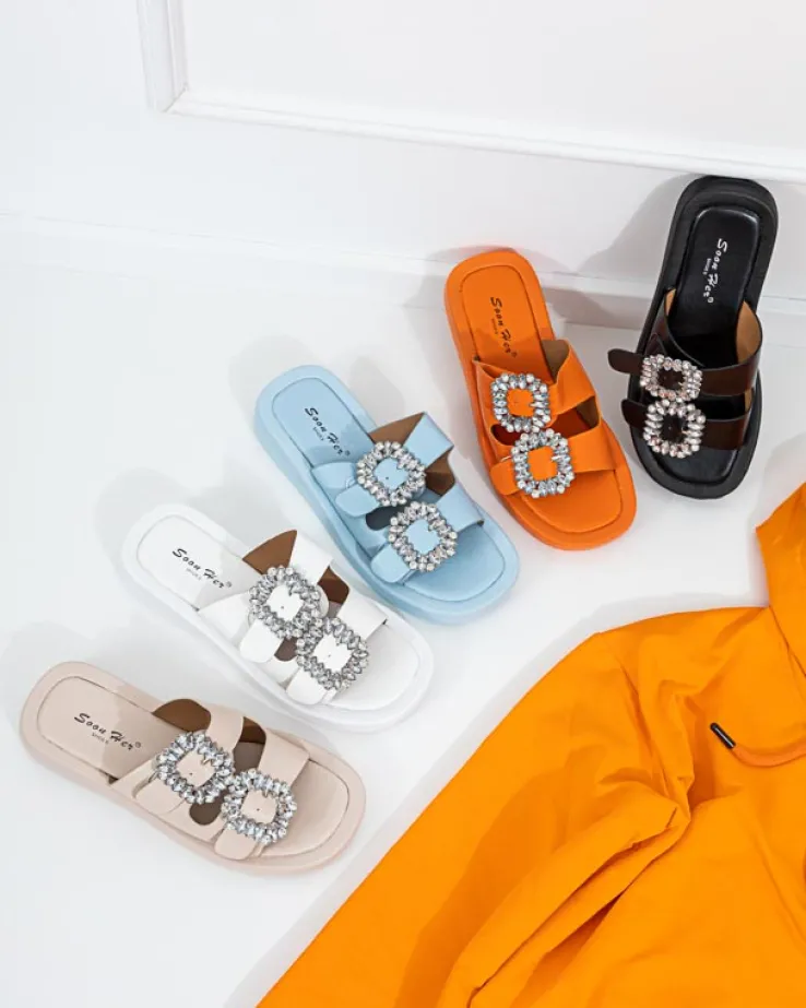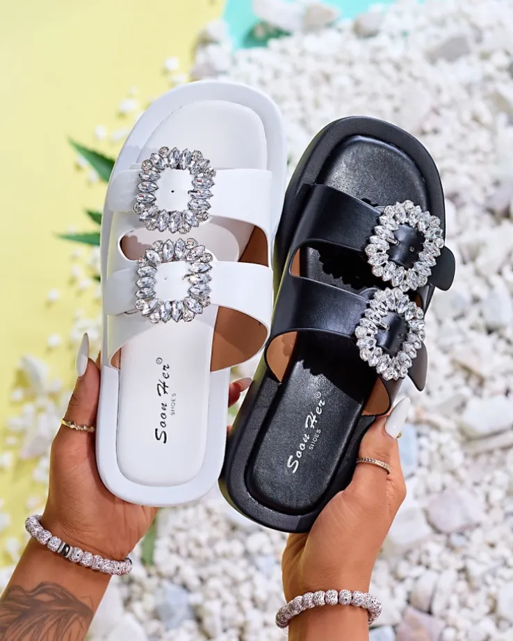 - Klapki damskie zapinane na sprzączki z kryształkami. Paski i wkładka wykonane ze skóry ekologicznej, podeszwa jest gumowa. Świetne na letnie dni!