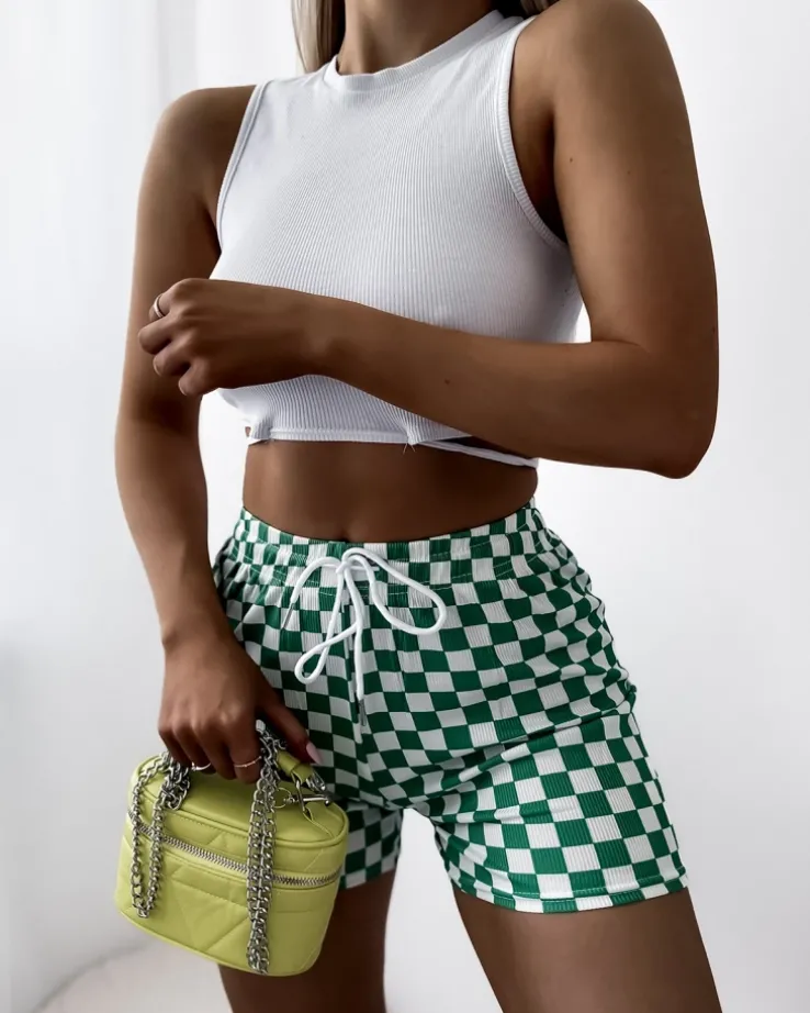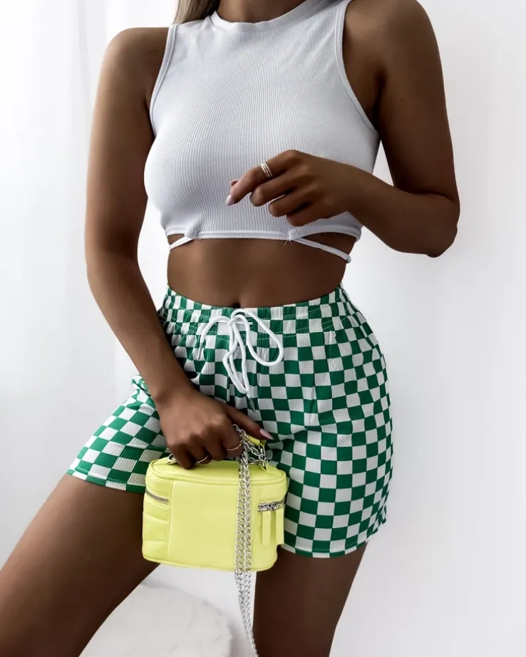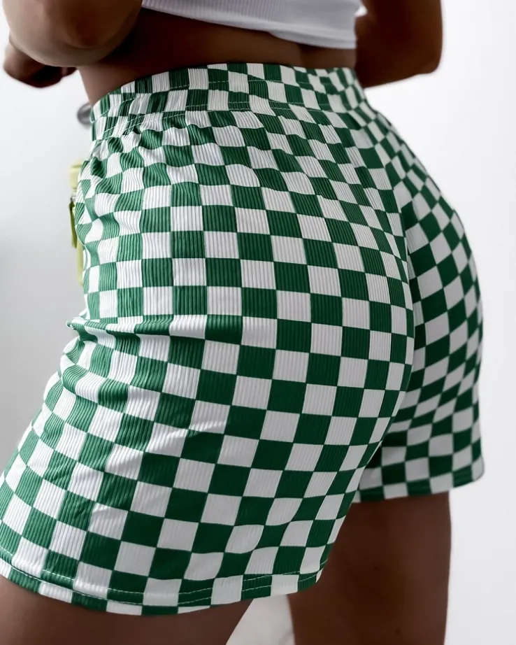 - Wygodne krótkie spodenki wykonane z miękkiej tkaniny zdobionej wzorem w kratkę. Model z elastyczną gumką i wiązanymi troczkami w pasie. Idealne dla tych, którzy cenią komfort. UWAGA: dokładność pomiaru (+/-) 1 cm.