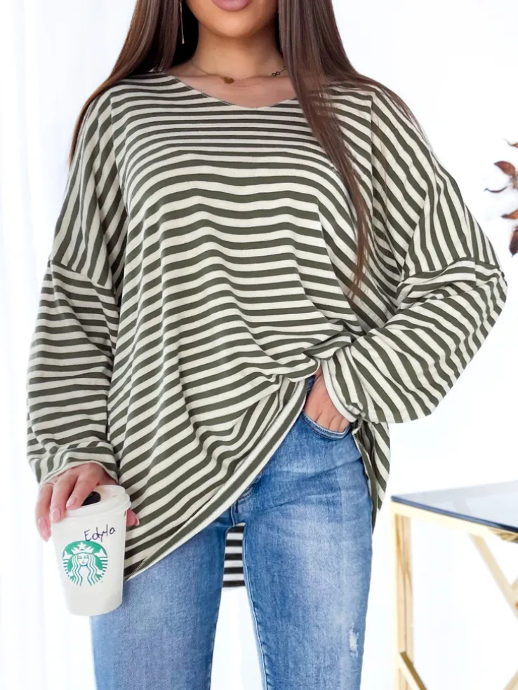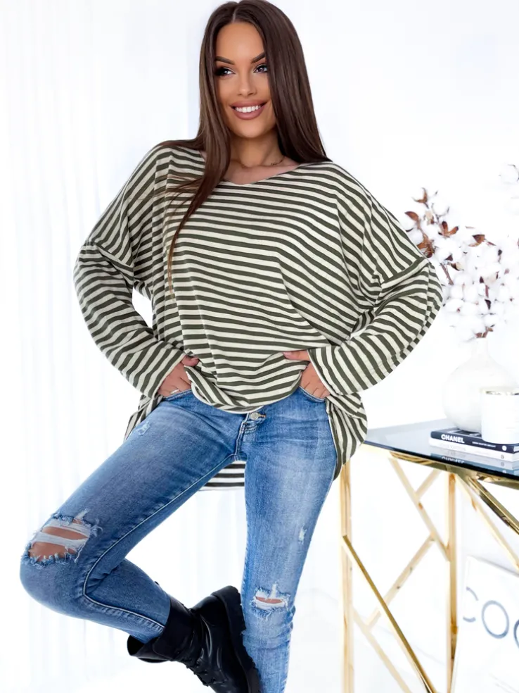 - Przepiękna damska bluzka w paski. Model z dekoltem w serek, wykonany z lekkiego, zwiewnego materiału. Niezbędny element garderoby! UWAGA: dokładność pomiaru (+/-) 1 cm. Wymiary mierzone na płasko.
