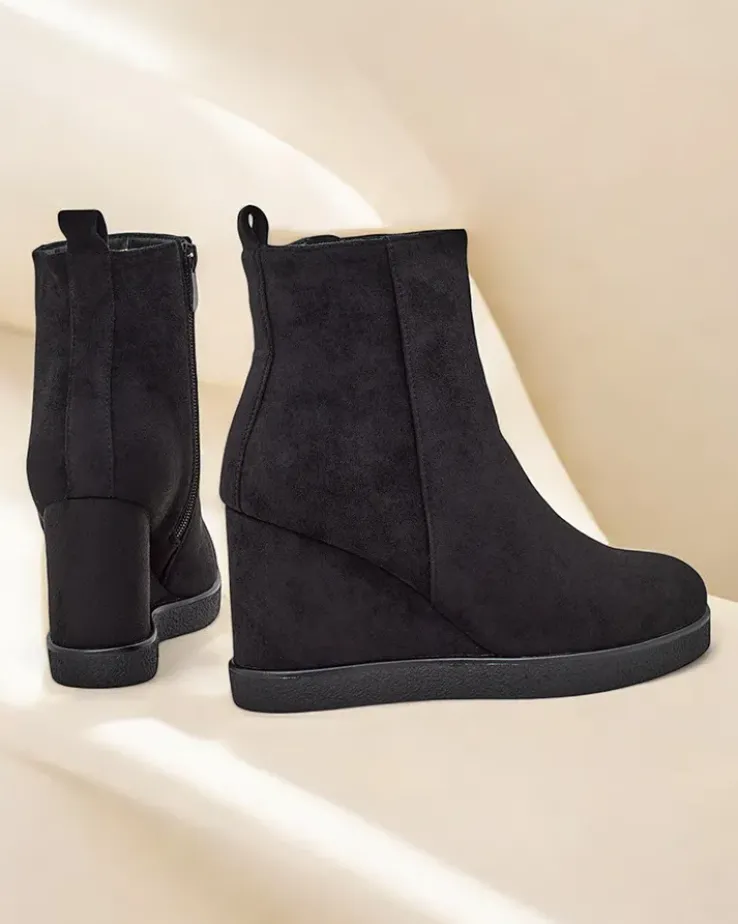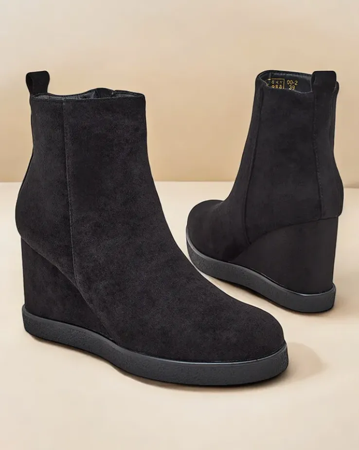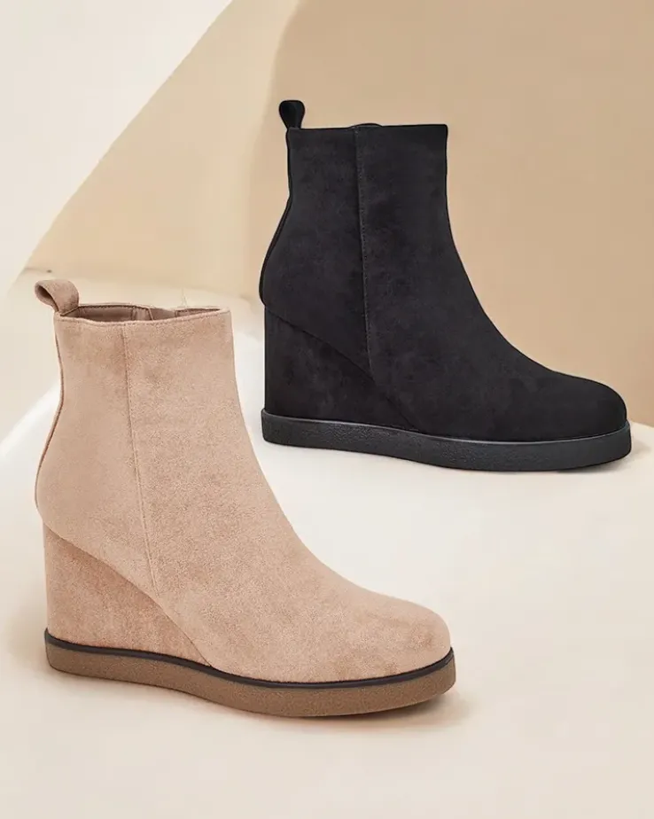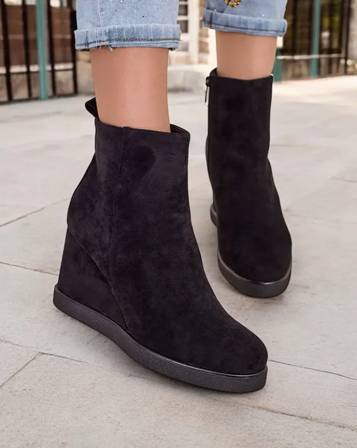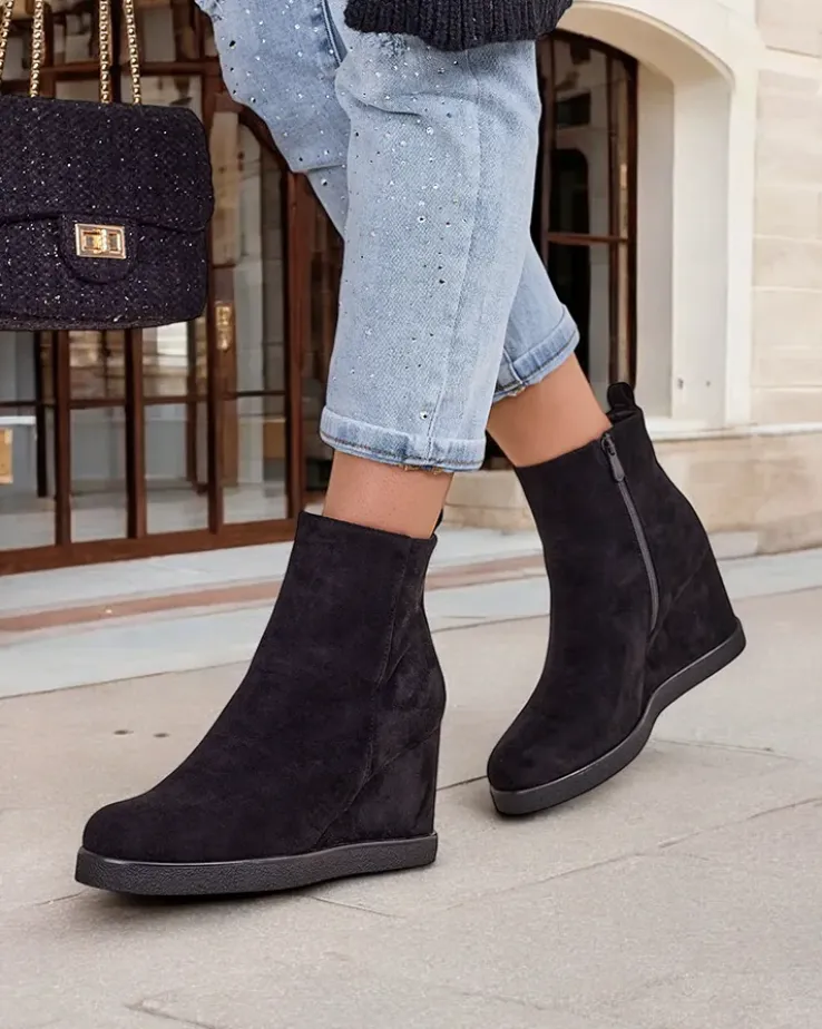 - Eleganckie damskie botki na koturnie, wykonane z eko-zamszu. Obuwie wypełnione od środka futerkiem. Idealny wybór na jesień!