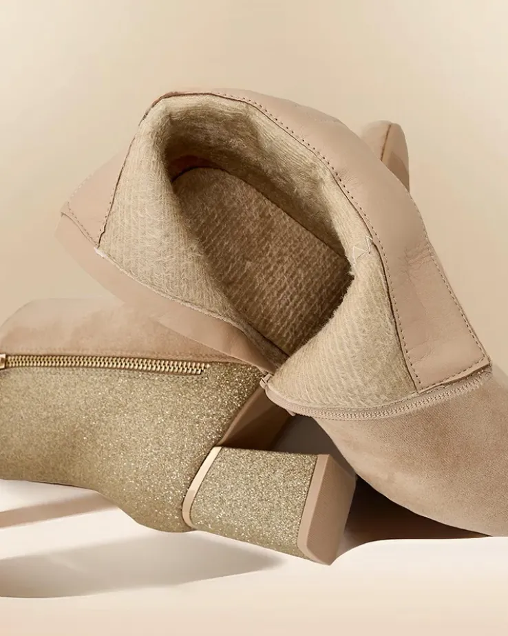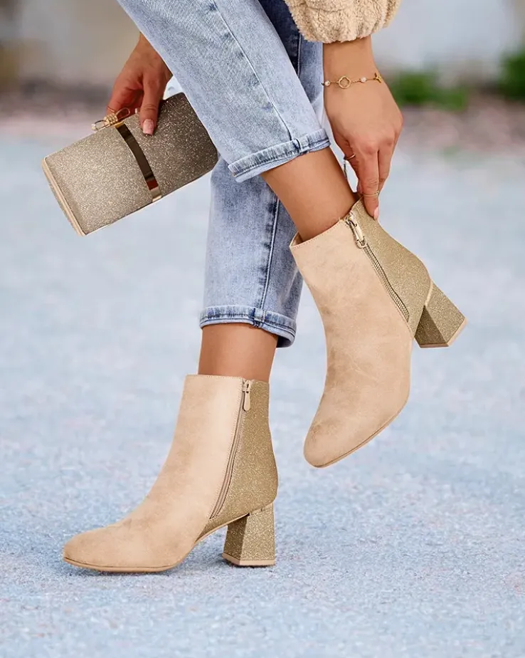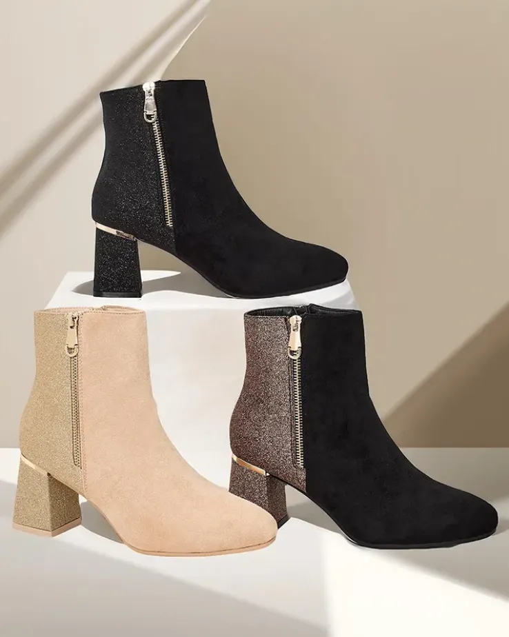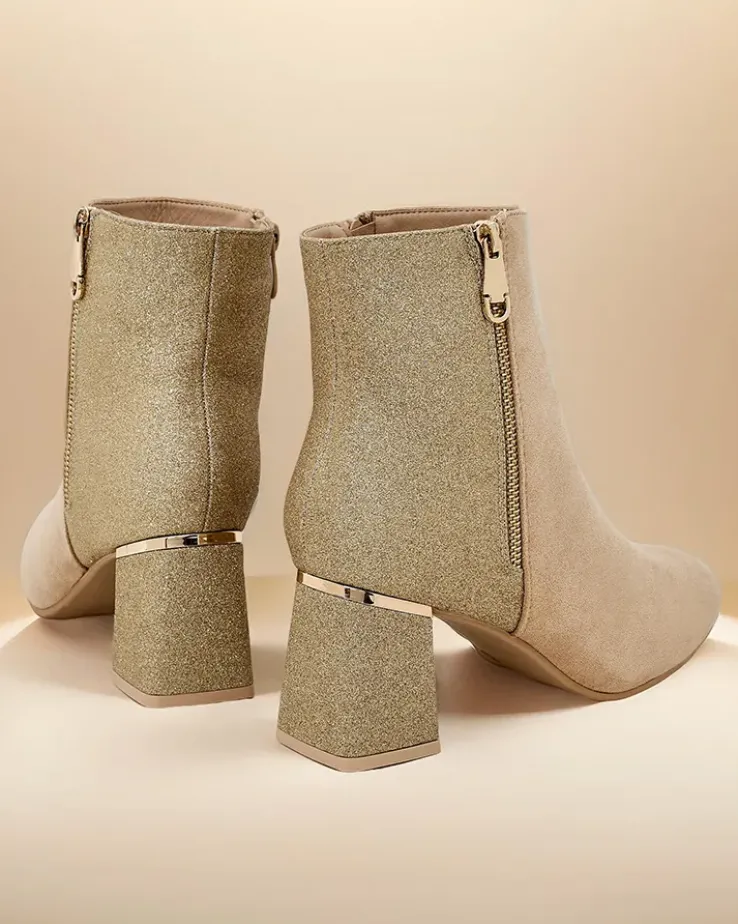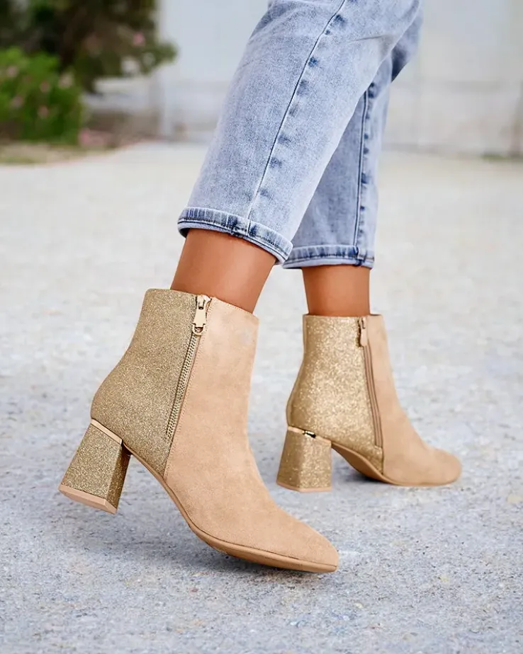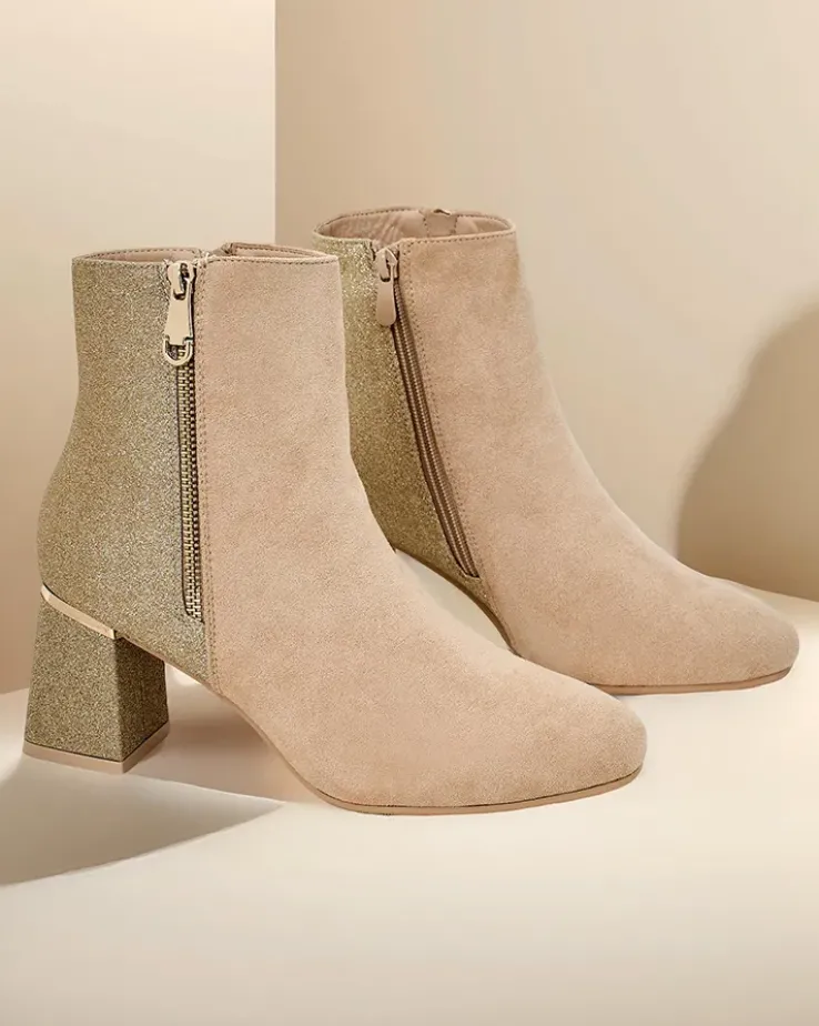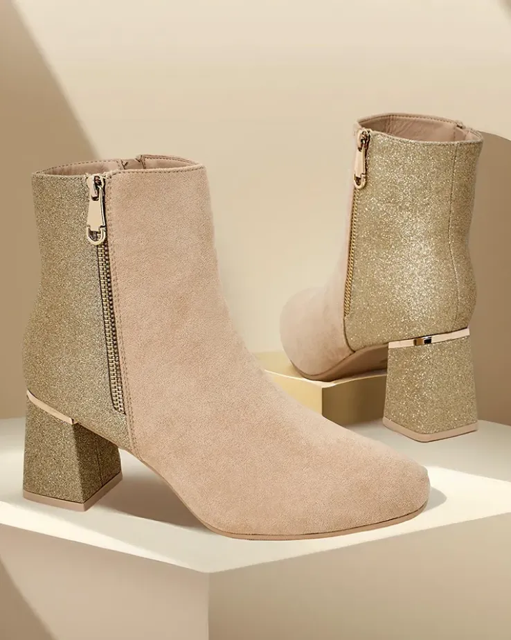 - Te eleganckie botki łączą nowoczesny design z wyjątkowym komfortem. Wykonane z połączenia eko skóry zamszowej i tkaniny z brokatem. Słupek zapewnia stabilność, a zamek ułatwia zakładanie. Posiadają okrągły nosek i delikatne ocieplenie w formie futerka.
