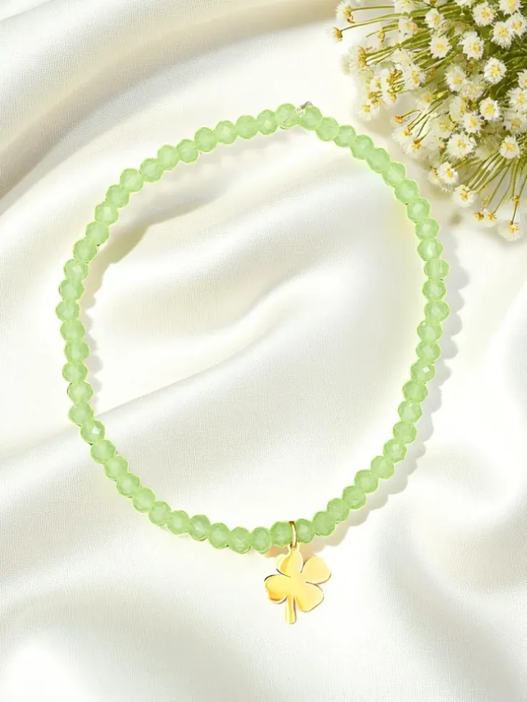 - Bransoletka z koralikami i zawieszką koniczynki to stylowy talizman szczęścia. Delikatna i elegancka, symbolizuje pomyślność, nadzieję i pozytywną energię. Idealna na co dzień, jako subtelny dodatek z wyjątkowym przesłaniem.