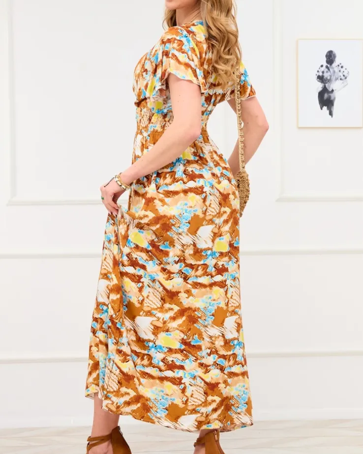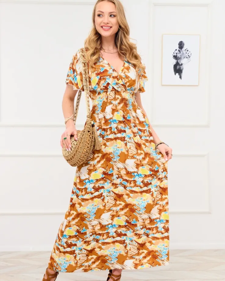 - Modna damska sukienka o długości midi, wykonana z miękkiej tkaniny z ciekawym wzorem. Model z kopertowym dekoltem, posiada krótkie rękawy i szeroką gumę podkreślającą talię. Doskonała na co dzień! UWAGA: Dokładność pomiaru (+/-) 1 cm.
