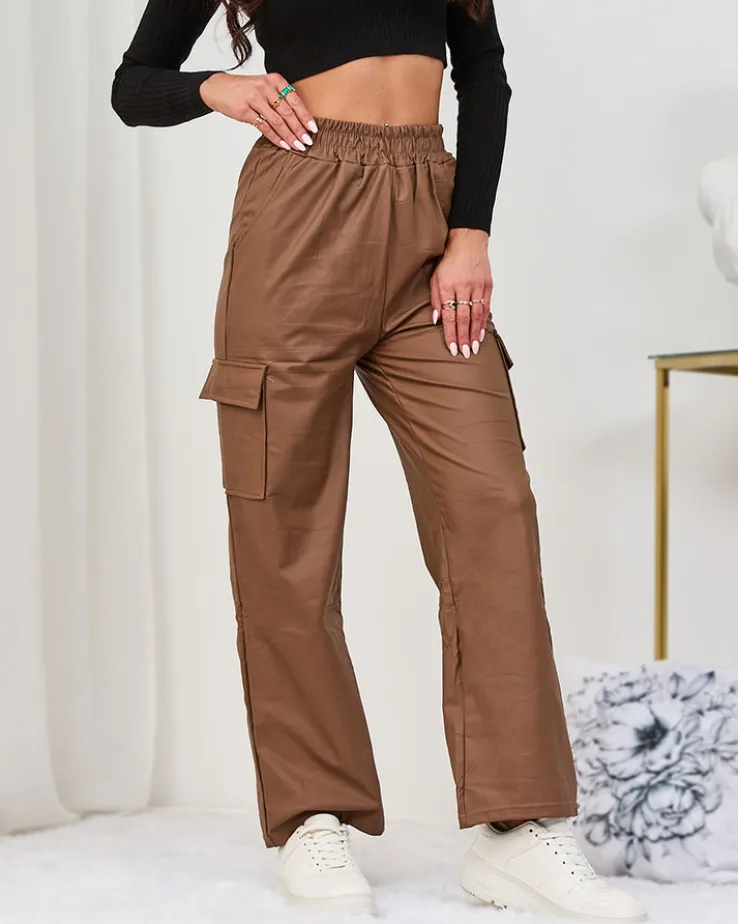 - Kultowe damskie szerokie spodnie typu bojówki, wykonane ze skóry ekologicznej. Model posiada rozciągliwą gumkę w pasie i cztery wsuwane kieszenie. Doskonałe na co dzień! UWAGA: Dokładność pomiaru (+/-) 1 cm.