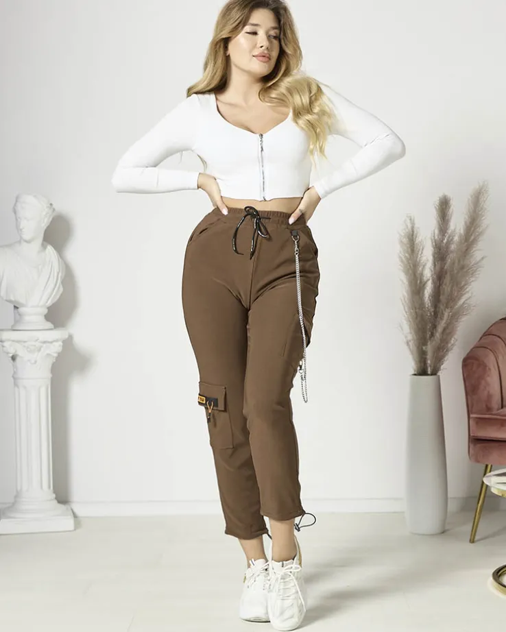 - Rewelacyjne damskie materiałowe spodnie typu bojówki, wykonane z rozciągliwego materiału. Model posiada gumę oraz troczki w pasie i 4 wsuwane kieszenie. Dodatkowo ozdobny, odpinany łańcuszek. Idealne do sneakersów! Dokładność pomiaru (+/-) 1 cm.