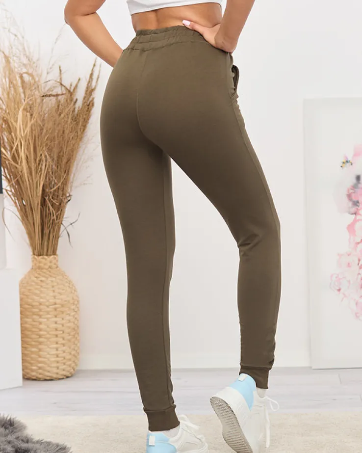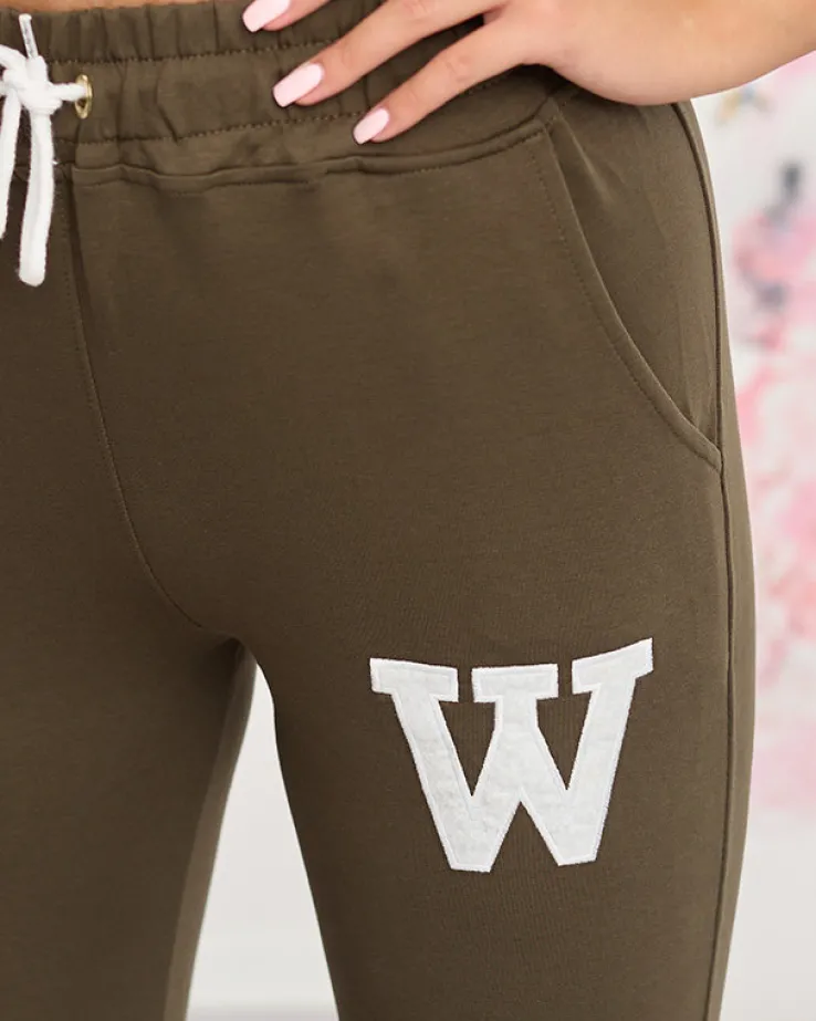 - Super modne damskie spodnie dresowe, zdobione kolorową naszywką w kształcie litery „W’. Model z 2 wsuwanymi kieszeniami, posiada gumę oraz wiązanie troczki w pasie, nogawki wykończone szerokimi gumami ściągającymi. Dokładność pomiaru (+/-) 1 cm.
