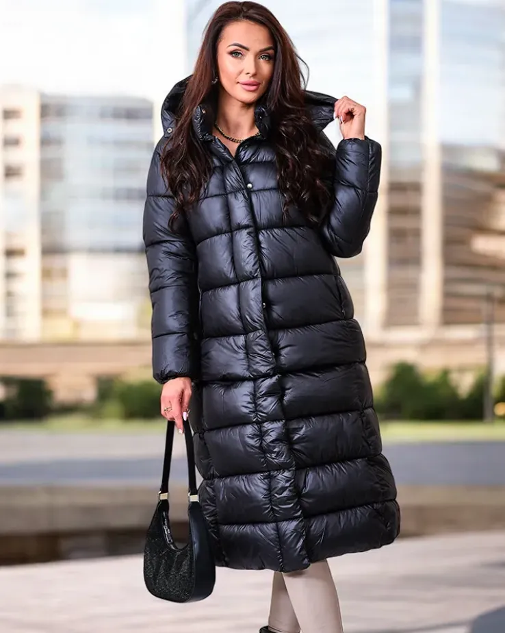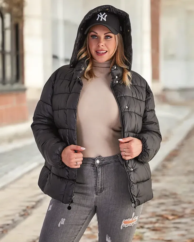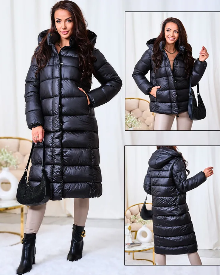 - Ciepła damska kurtka zimowa z odpinanym dołem. Model z możliwością noszenia za kolano lub do bioder. Posiada kaptur, 2 zapinane kieszenie i wypełnienie z puchu syntetycznego. Kurtka zapinana suwakiem i na zatrzaski.