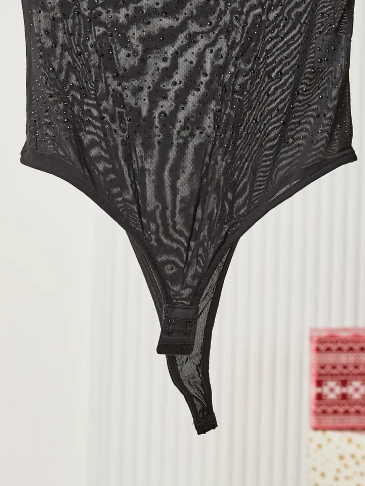 - Body z siateczki z cyrkoniami nadającymi im elegancji. Długi rękaw dodaje subtelności. Zapięcie na haftki gwarantuje idealne dopasowanie. Doskonałe na wieczór pełen wyrafinowanego blasku. UWAGA: Dokładność pomiaru (+/-) 1 cm.