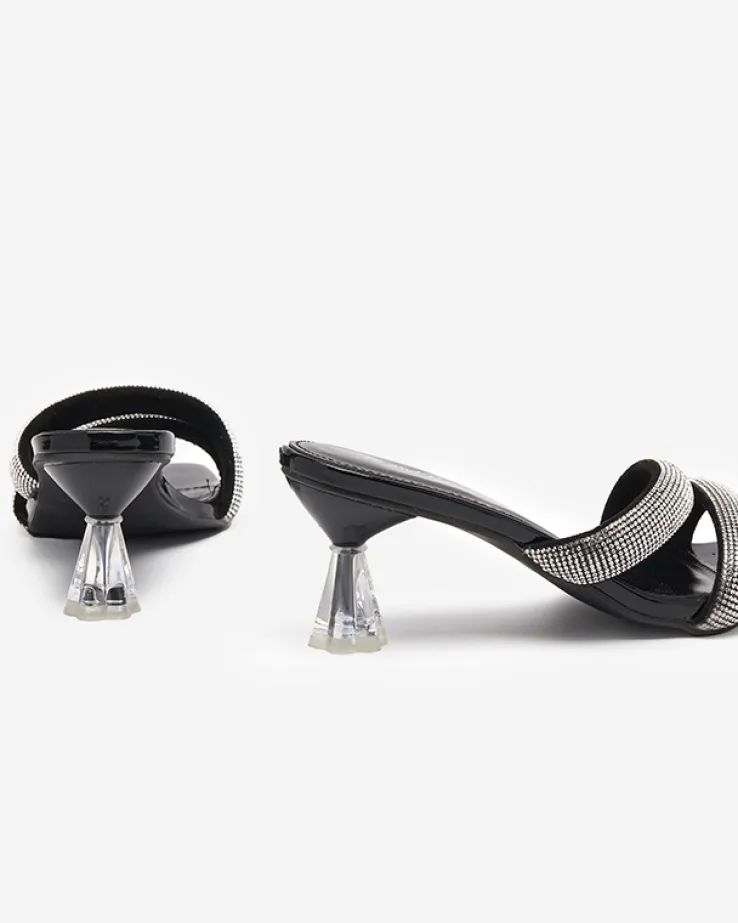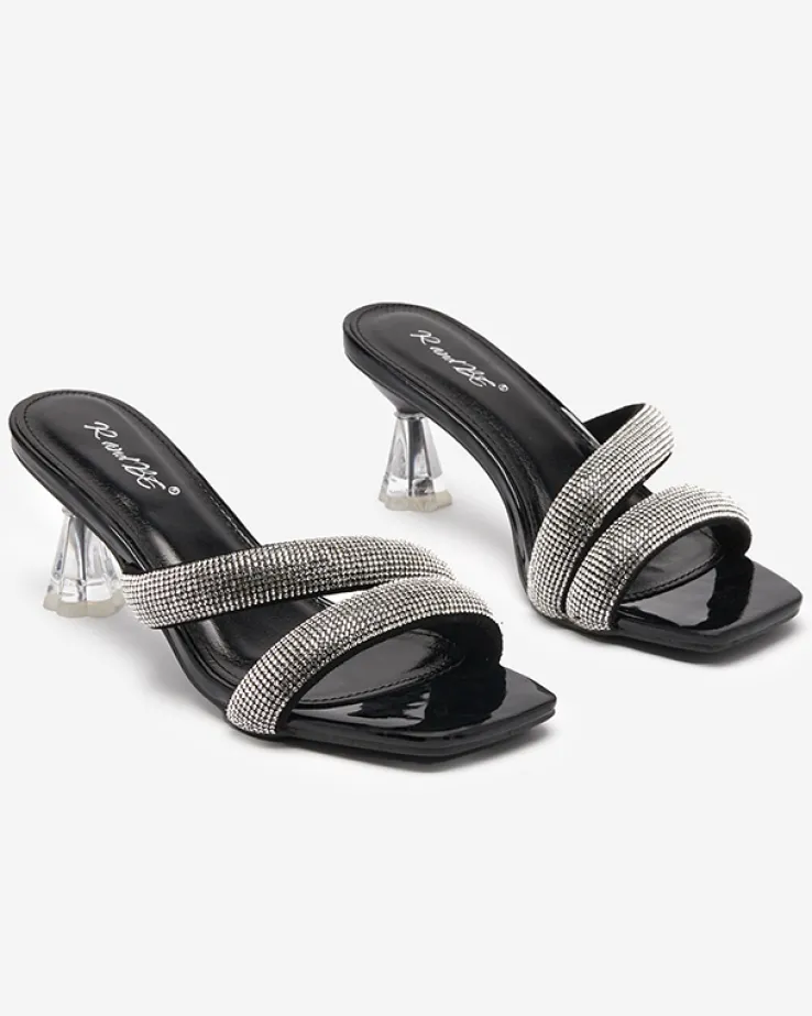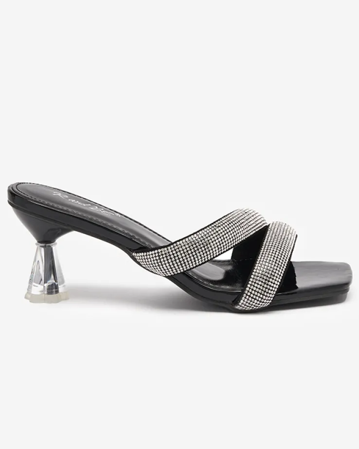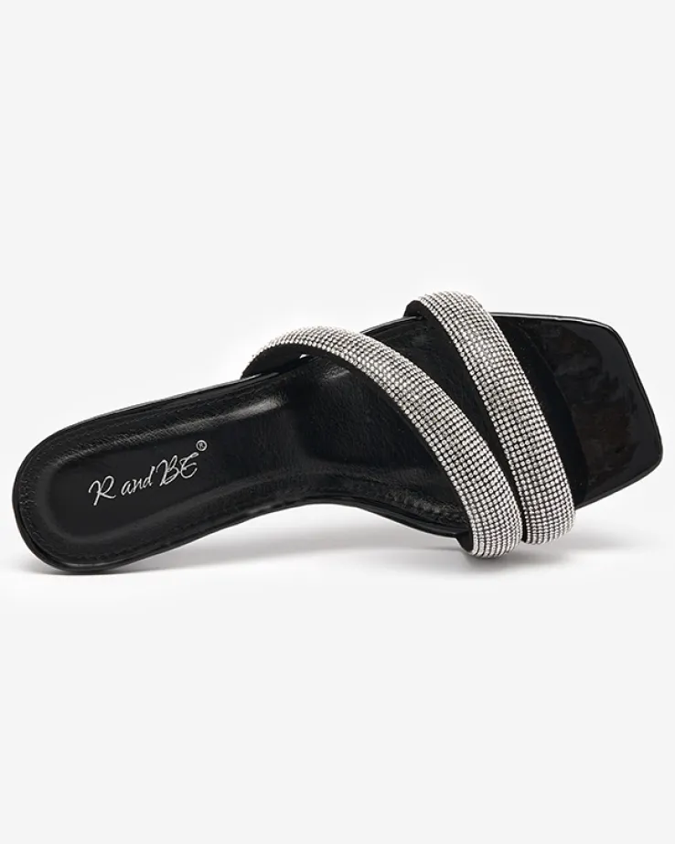 - Wyjątkowe damskie klapki na niskim obcasie. Para jest wykonana ze skóry ekologicznej lakierowanej, wkładka to skóra ekologiczna. Paseczki dekorowane cyrkoniami. Idealne obuwie do tworzenia modnych i casualowych outfitów!