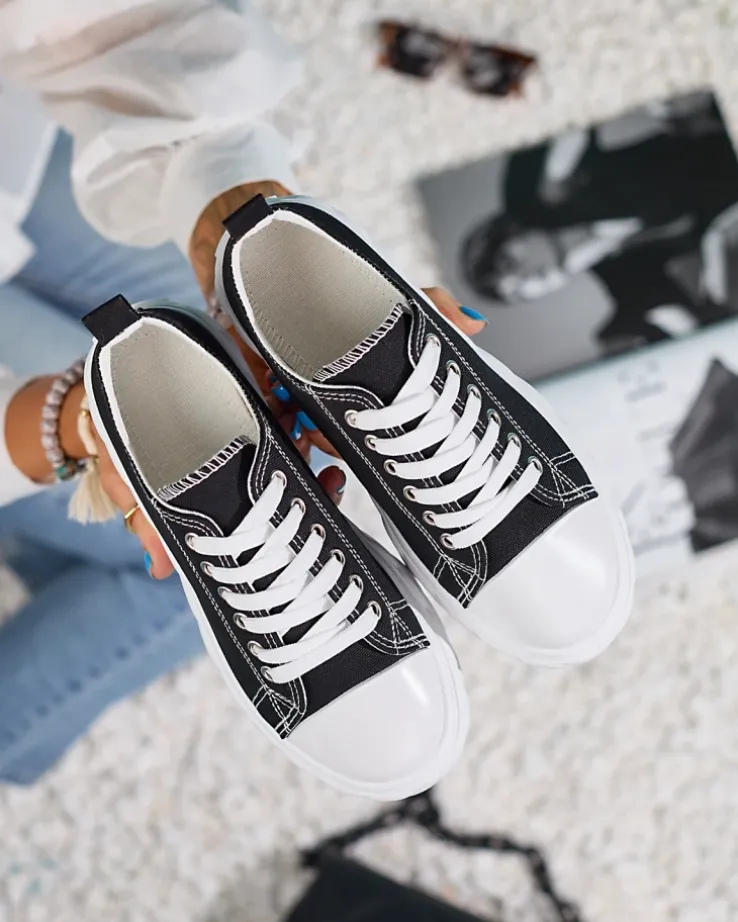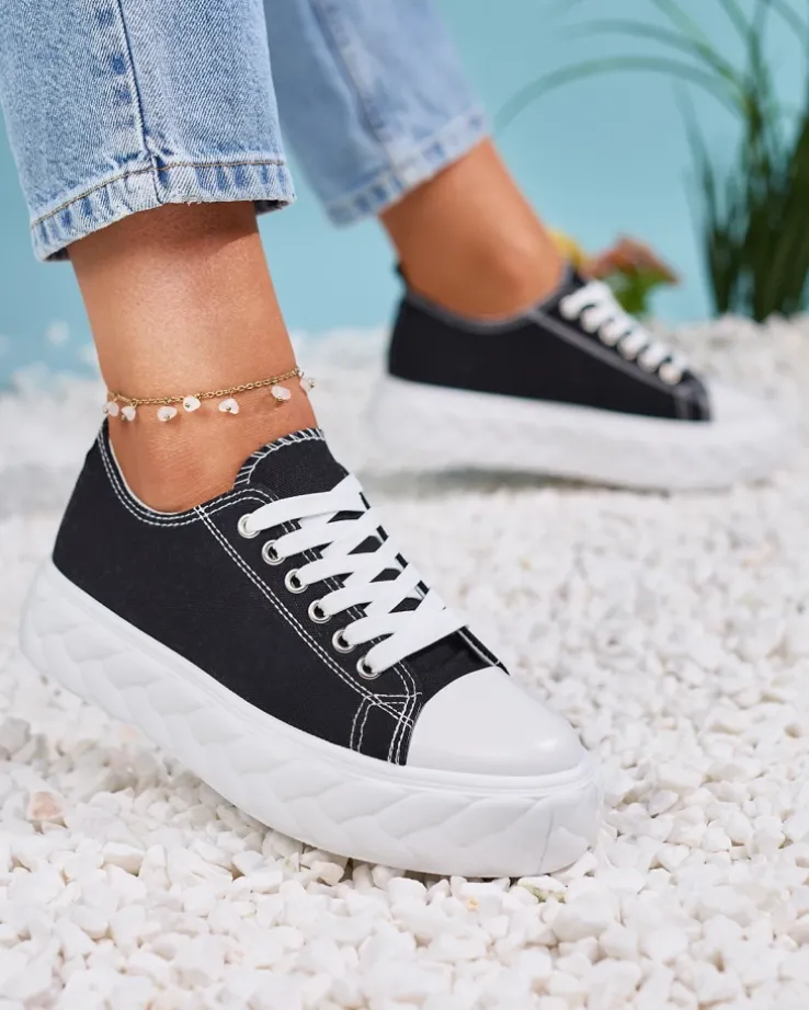 - Mega stylowe damskie jednokolorowe trampki. Para w całości wykonana z materiału tkaninowego. Model na grubej platformie zdobionej tłoczeniem a’la warkocz. Cholewka jest sznurowana. Będą świetnie pasowały do codziennych stylizacji!