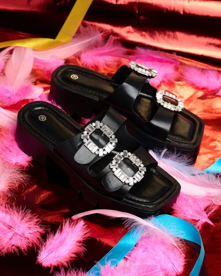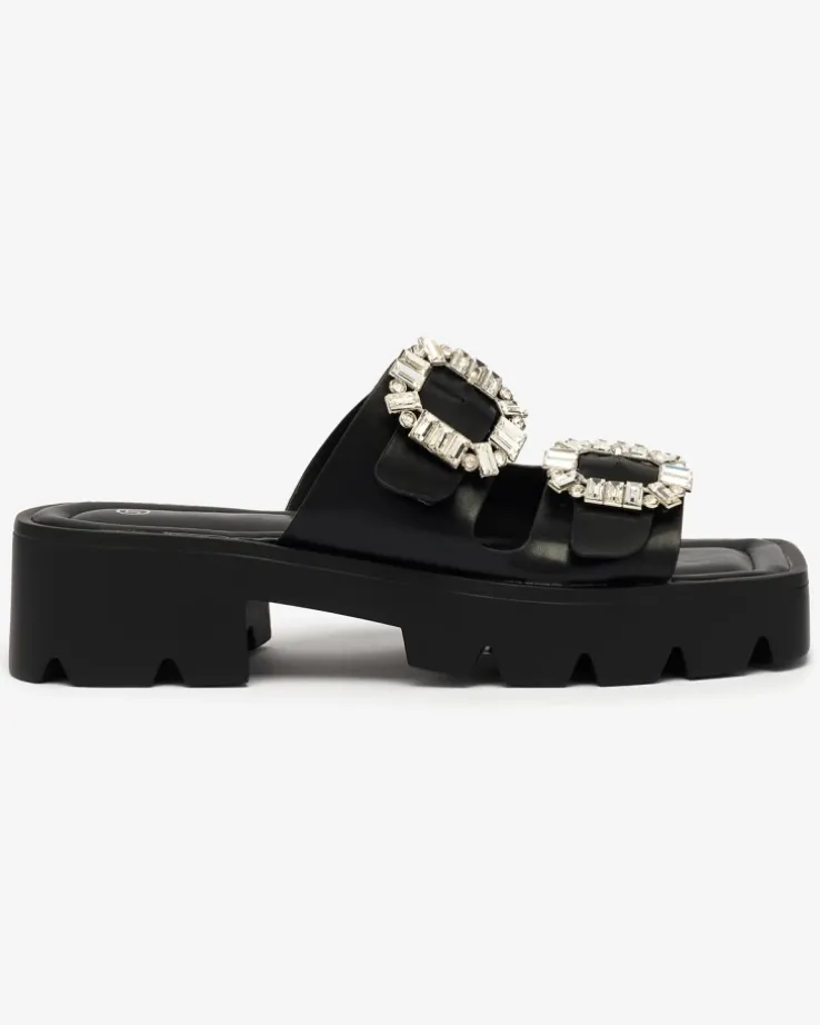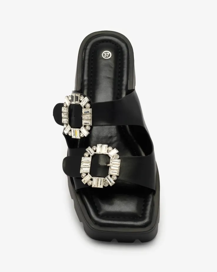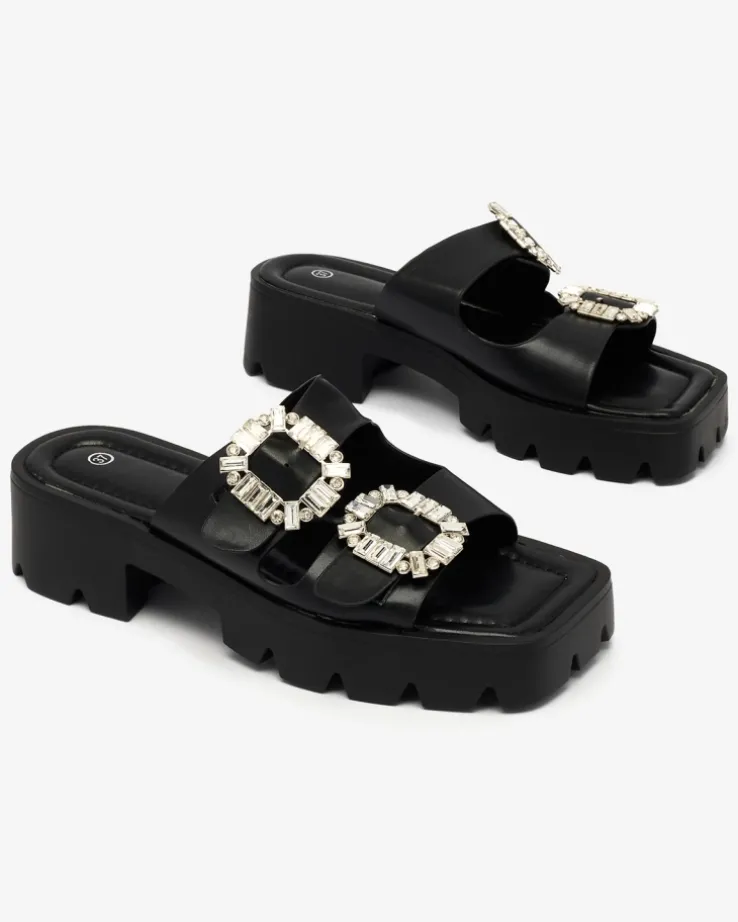 - Modne damskie klapki na masywnym obcasie z kryształkami na paseczkach. Para wykonana jest ze skóry ekologicznej, wkładka to również eko-skóra. Idealna baza dla wielu letnich outfitów!
