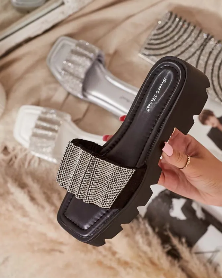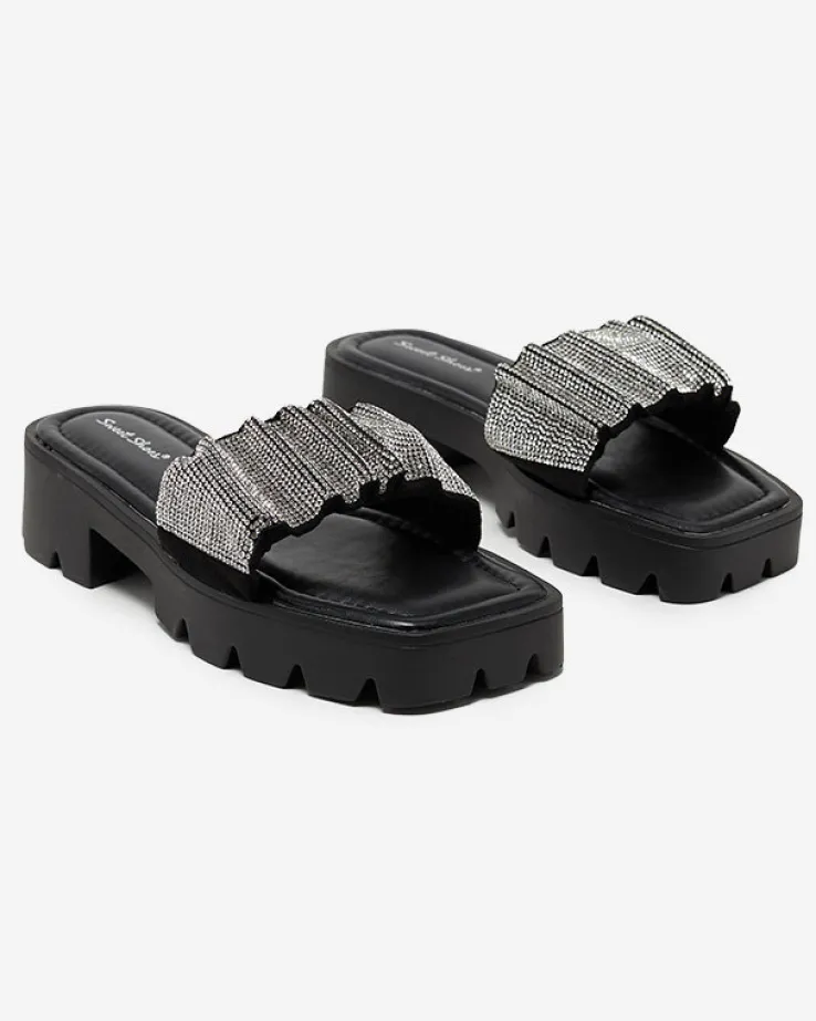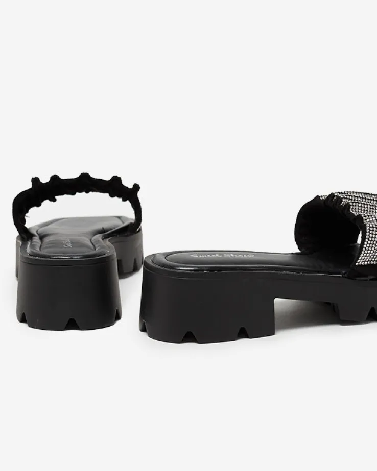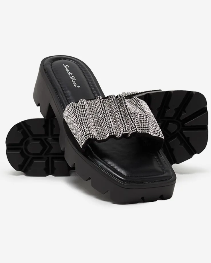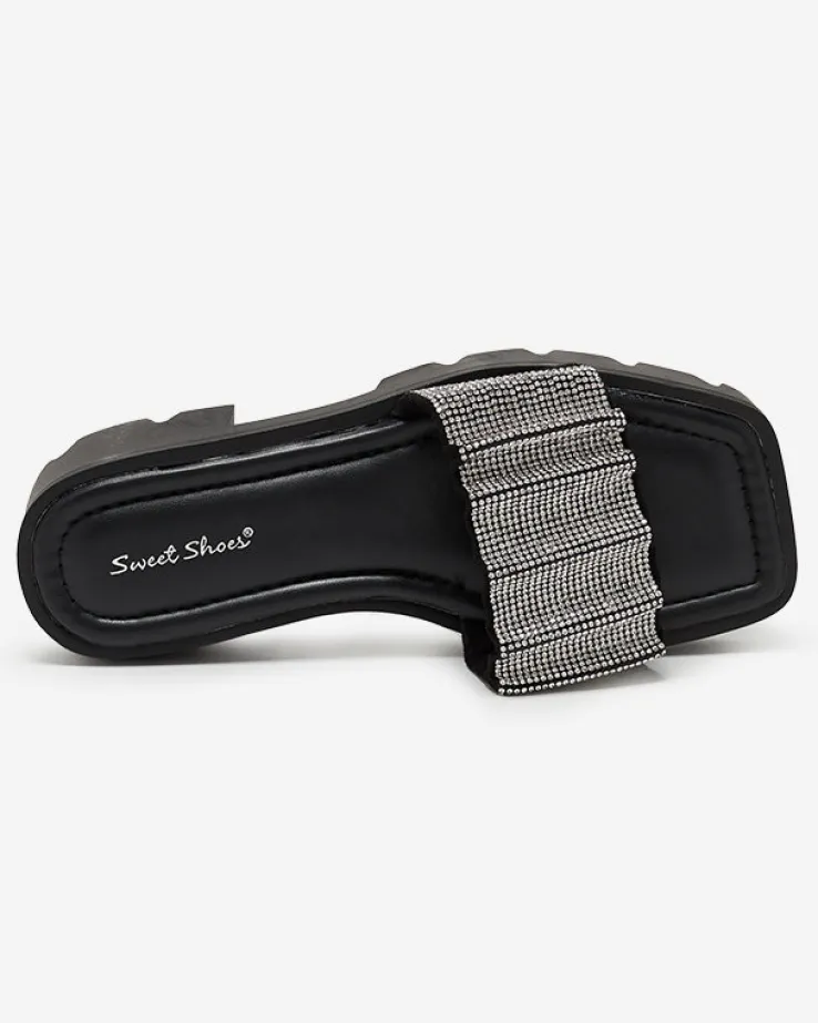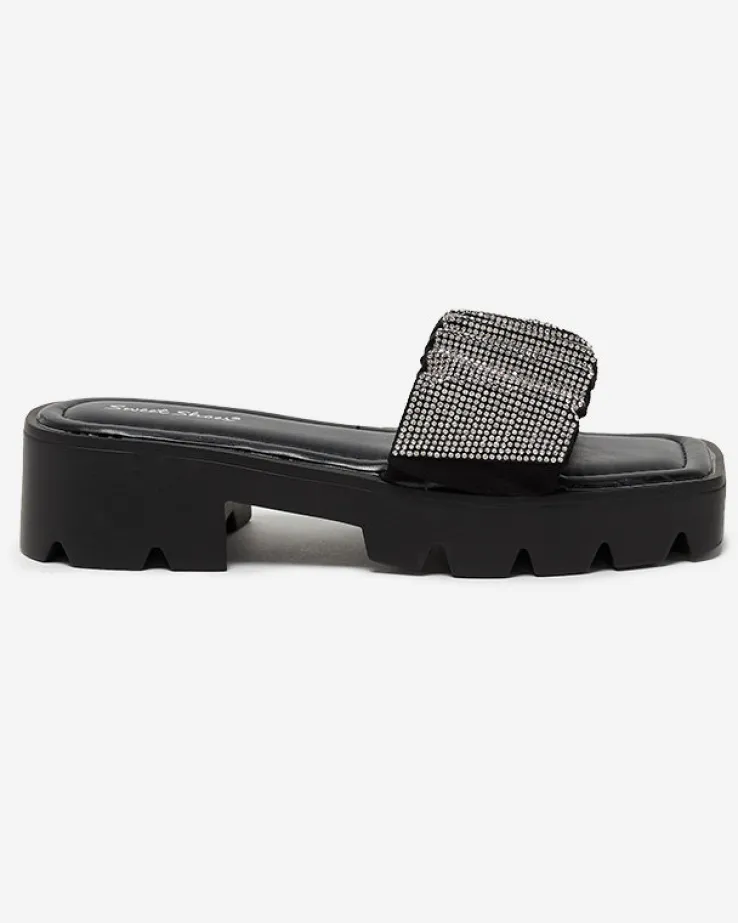 - Oryginalne klapki na obcasie z cyrkoniami na paseczkach, wykonane ze skóry ekologicznej. Wkładka to również eko skóra, podeszwa jest gumowa. Idealne do sukienek! UWAGA: model może posiadać delikatne zarysowania na podeszwie oraz obcasie.