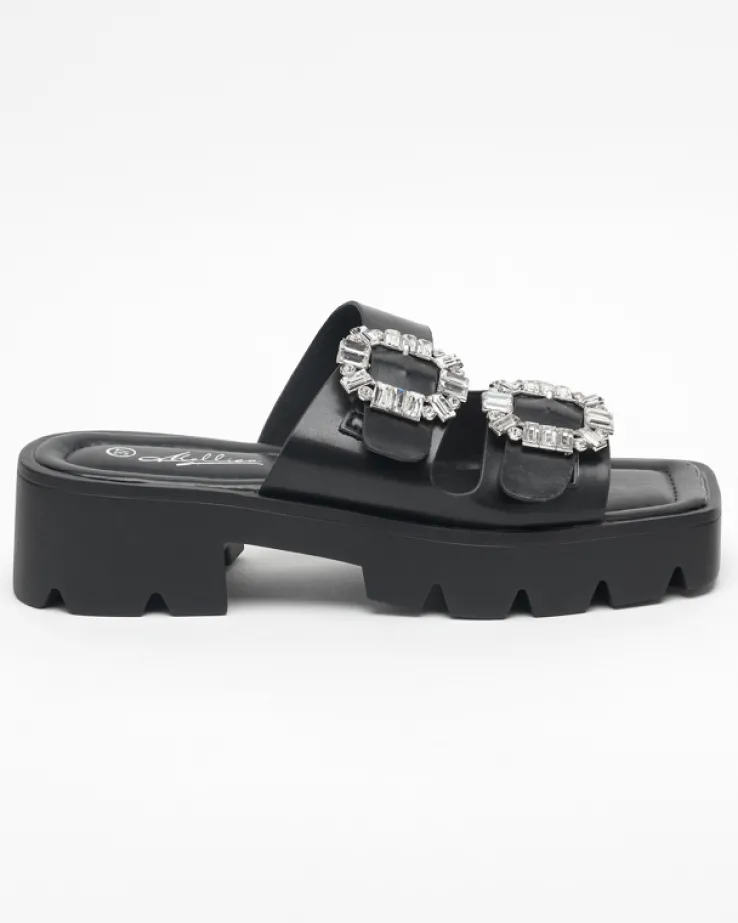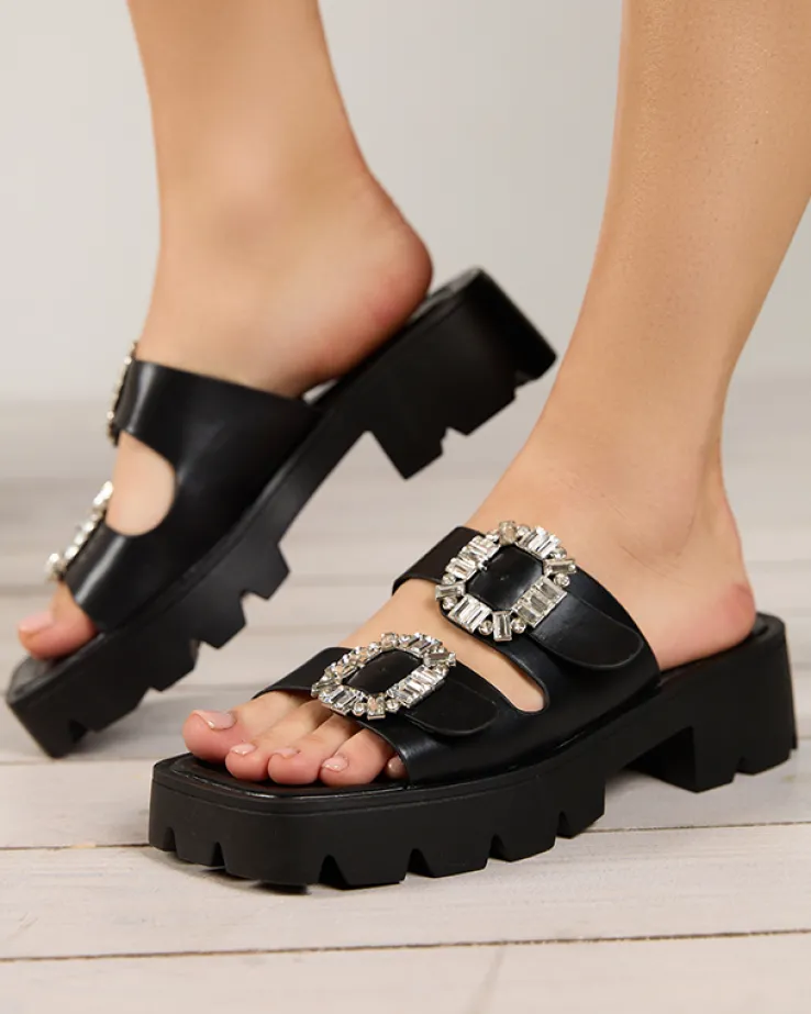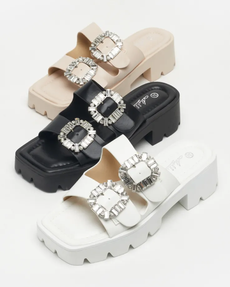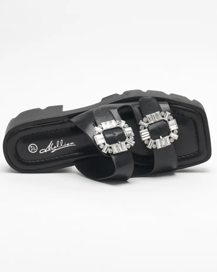 - Nietypowe klapki na obcasie z ozdobą z cyrkonii na paseczkach, wykonane ze skóry ekologicznej. Wkładka to również eko skóra, podeszwa jest gumowa. Idealne do sukienek! UWAGA: model może posiadać delikatne przebarwienia na podeszwie.