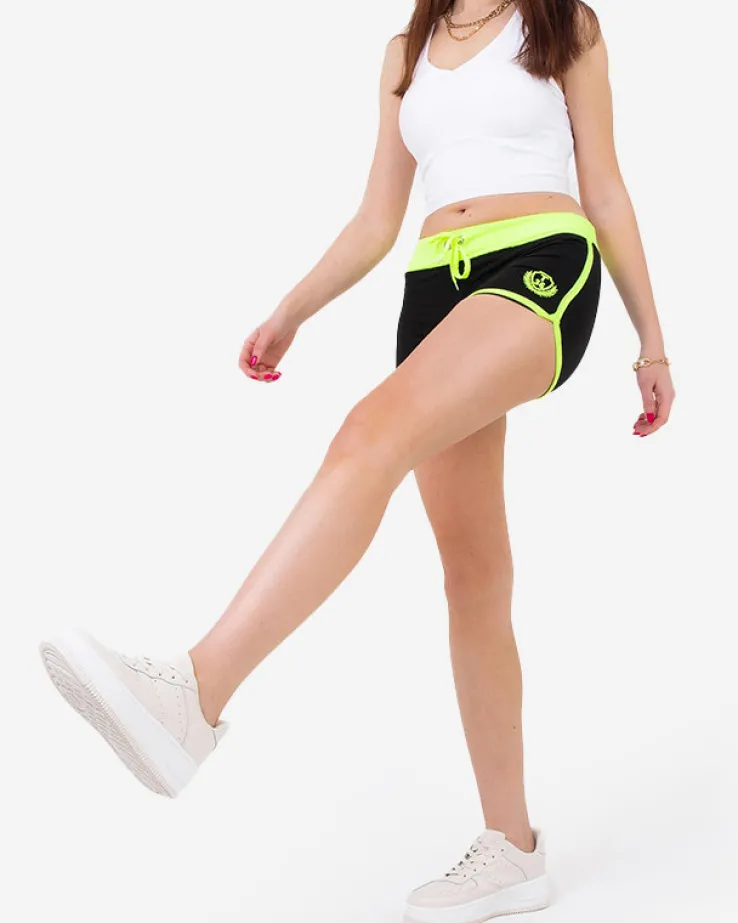 - Bardzo wygodne, krótkie spodenki wykonane z miękkiej, przyjemnej tkaniny. Model z elastyczną gumką i wiązanymi troczkami w pasie. Spodenki posiadają neonowe wstawki oraz stylowe naszywki.