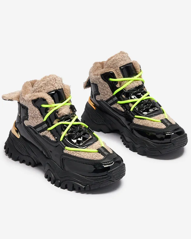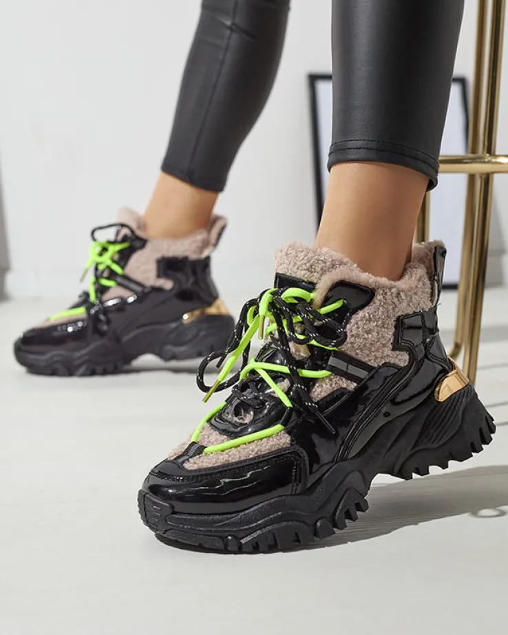 - Sportowe sneakersy damskie na grubej podeszwie, cholewka jest sznurowana i wykonana z połączenia lakierowanej eko skóry oraz tkaniny a’la futerko. Wnętrze w całości ocieplone sztucznym futerkiem. CZARNE SPORTOWE BUTY ZIMOWE DAMSKIE ŚNIEGOWCE ADBO