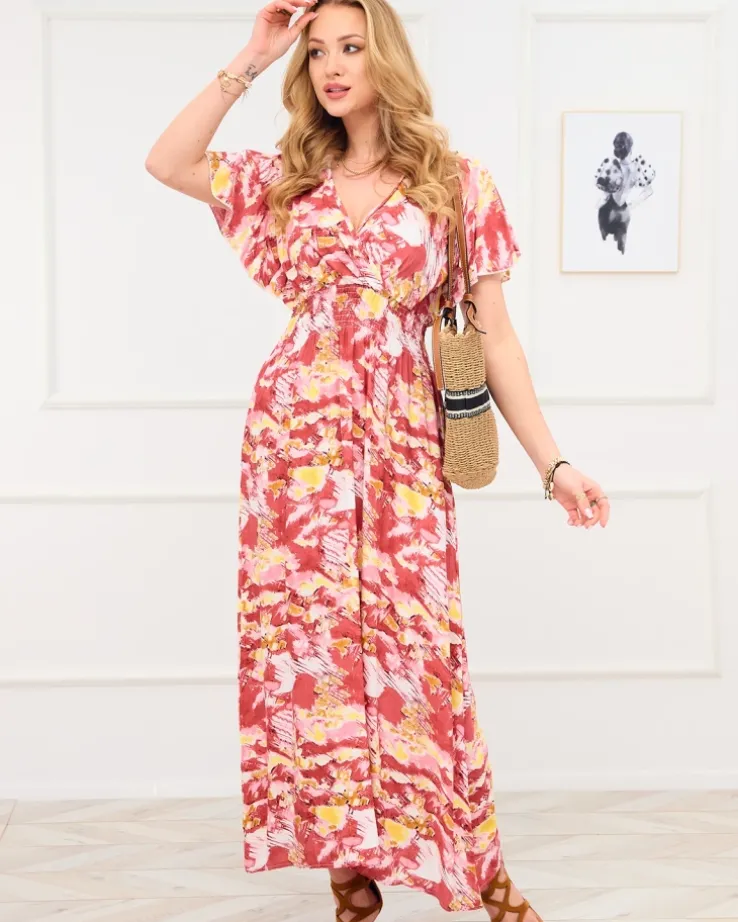 - Modna damska sukienka o długości midi, wykonana z miękkiej tkaniny z ciekawym wzorem. Model z kopertowym dekoltem, posiada krótkie rękawy i szeroką gumę podkreślającą talię. Doskonała na co dzień! UWAGA: Dokładność pomiaru (+/-) 1 cm.