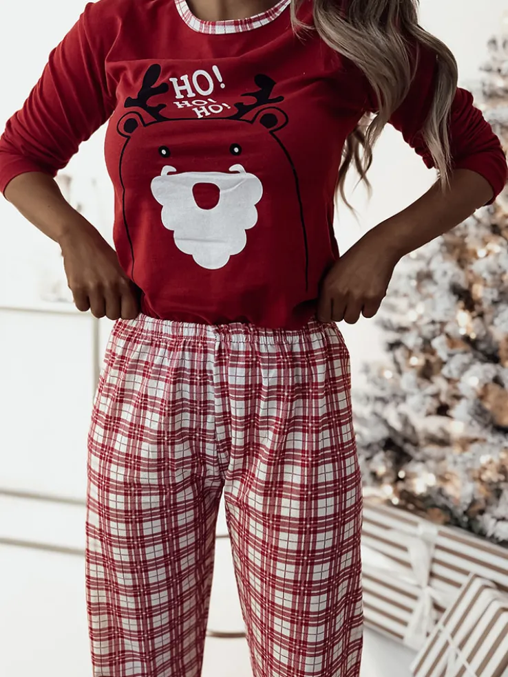 - Świąteczna damska 2-częściowa piżama wykonana z tkaniny bawełnianej wykończonej ozdobnym printem. Komplet posiada bluzkę z długimi rękawami oraz spodnie z gumą w pasie i prostymi nogawkami.