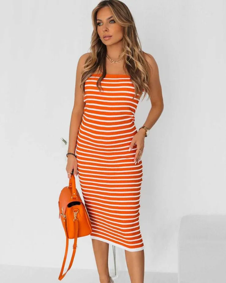 - Sukienka damska midi w paski, na cienkich ramiączkach i prostym dekoltem. Idealna na co dzień! UWAGA: Dokładność pomiaru (+/-) 1 cm. Wymiary mierzone na płasko.