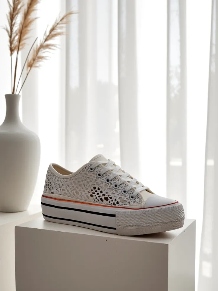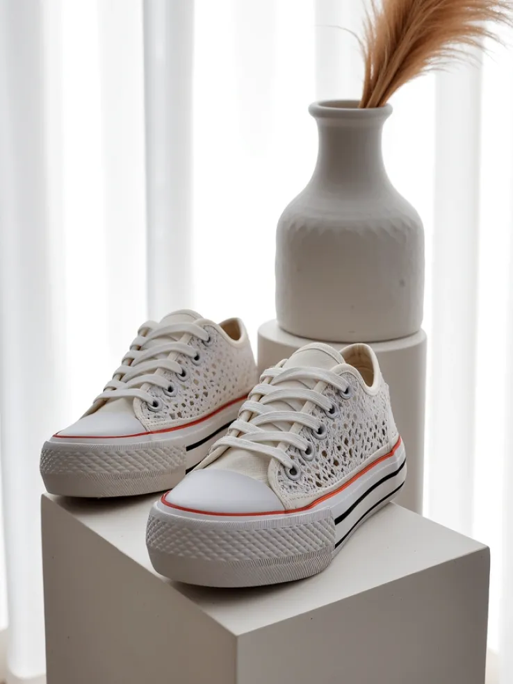 - Damskie buty na płaskiej podeszwie. Para w stylu casual jest wykonana z materiału tkaninowego z ażurowym wykończeniem, wkładka tkaninowa. Model posiada ozdobny haft. Idealne dla tych, którzy cenią komfort!