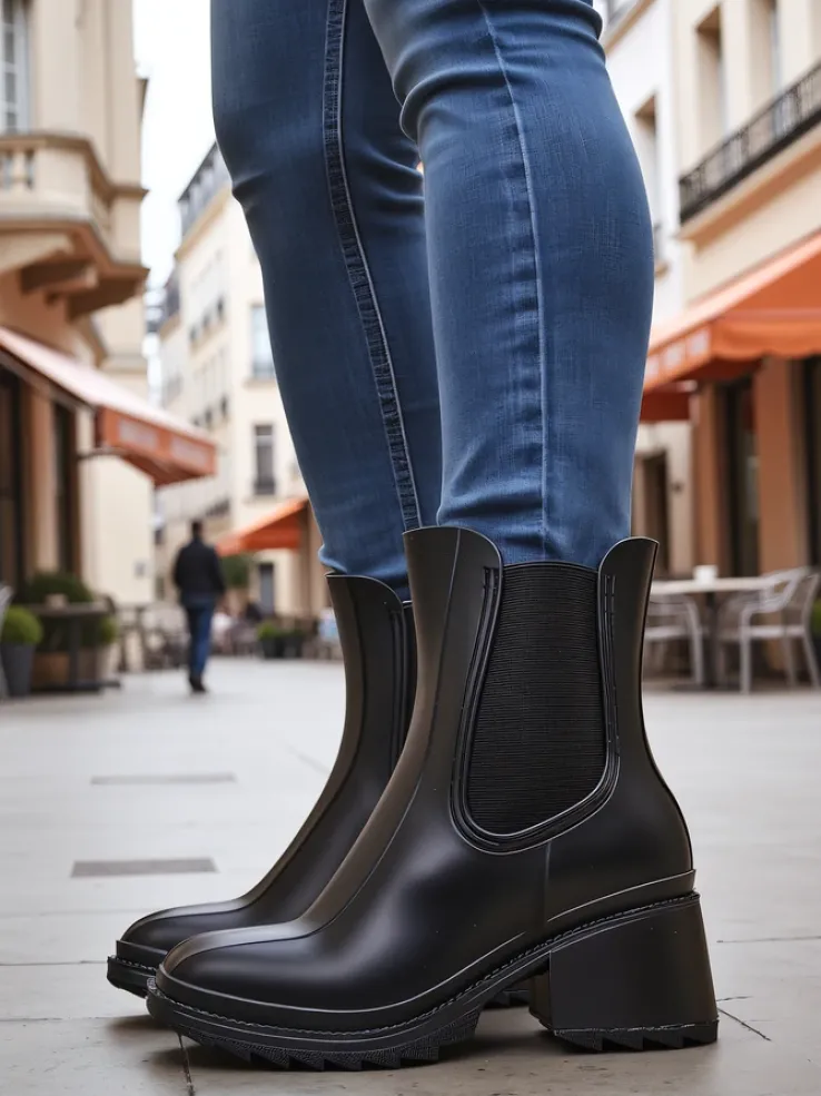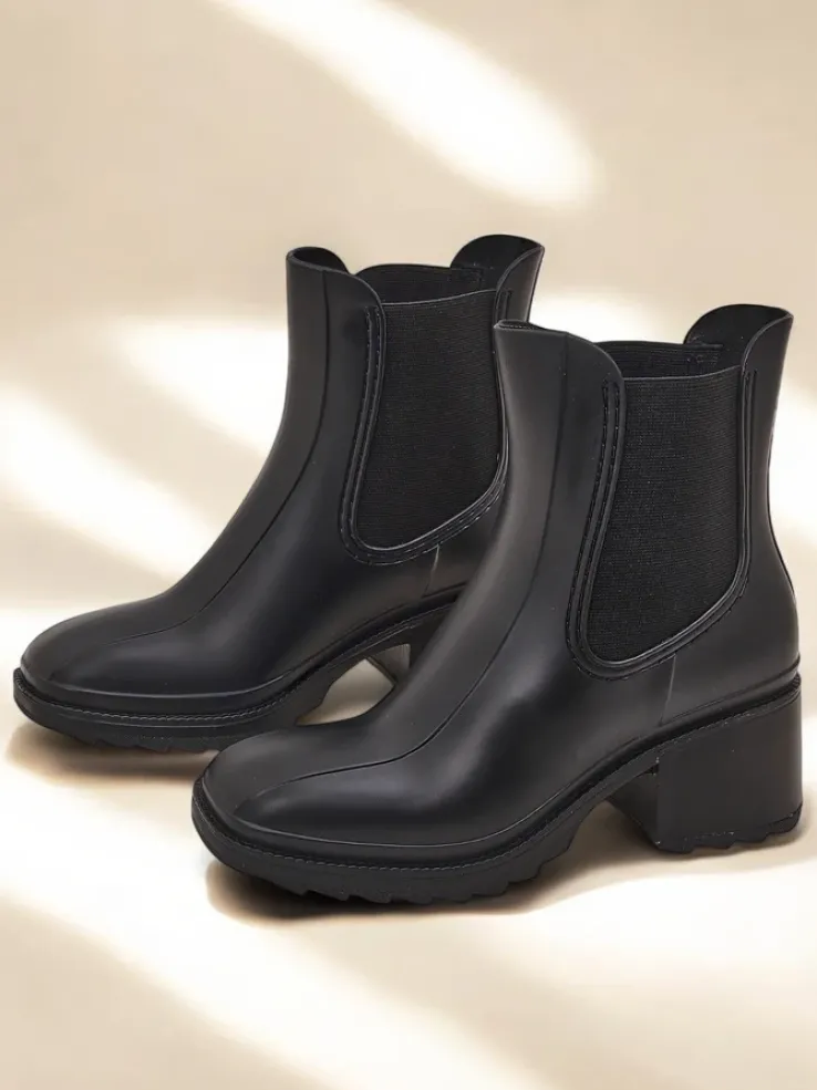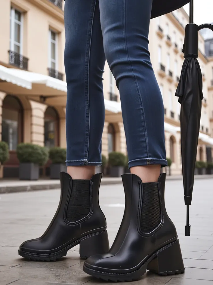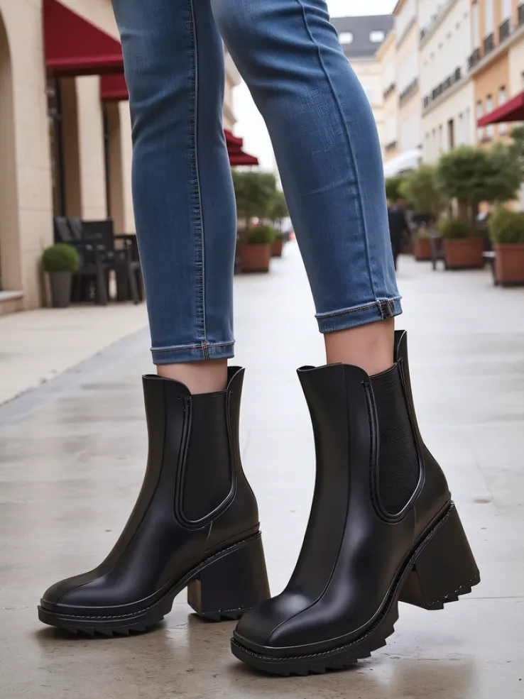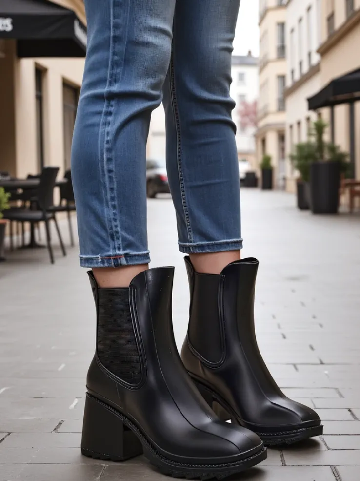 - Klasyczne, wsuwane damskie botki na płaskim obcasie, wykonane z materiału gumowego. W środku wkładka z tkaniny. Po bokach elastyczne wstawki. Idealne na jesienne deszczowe dni!