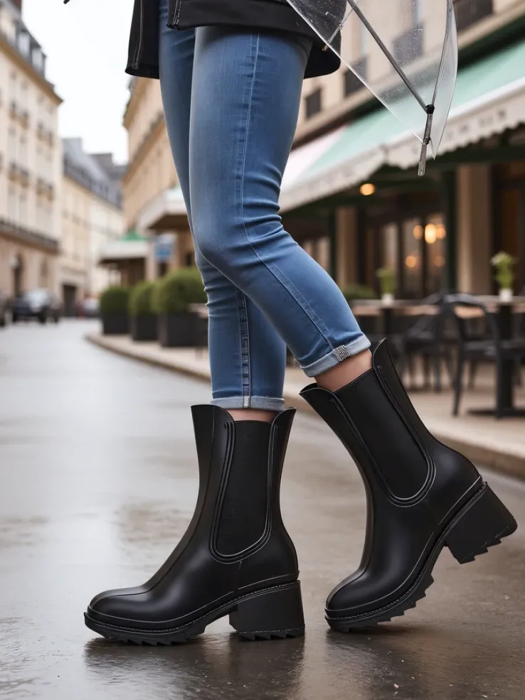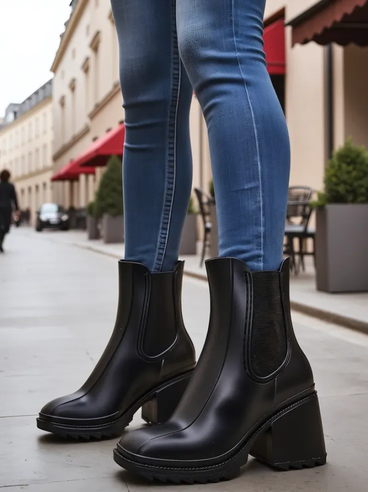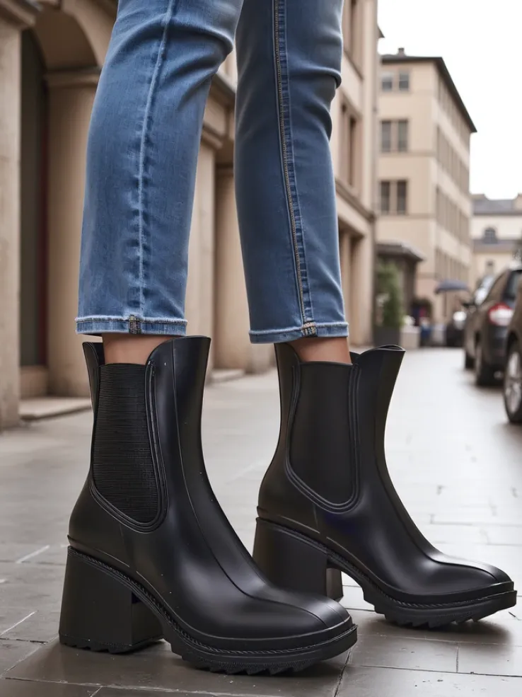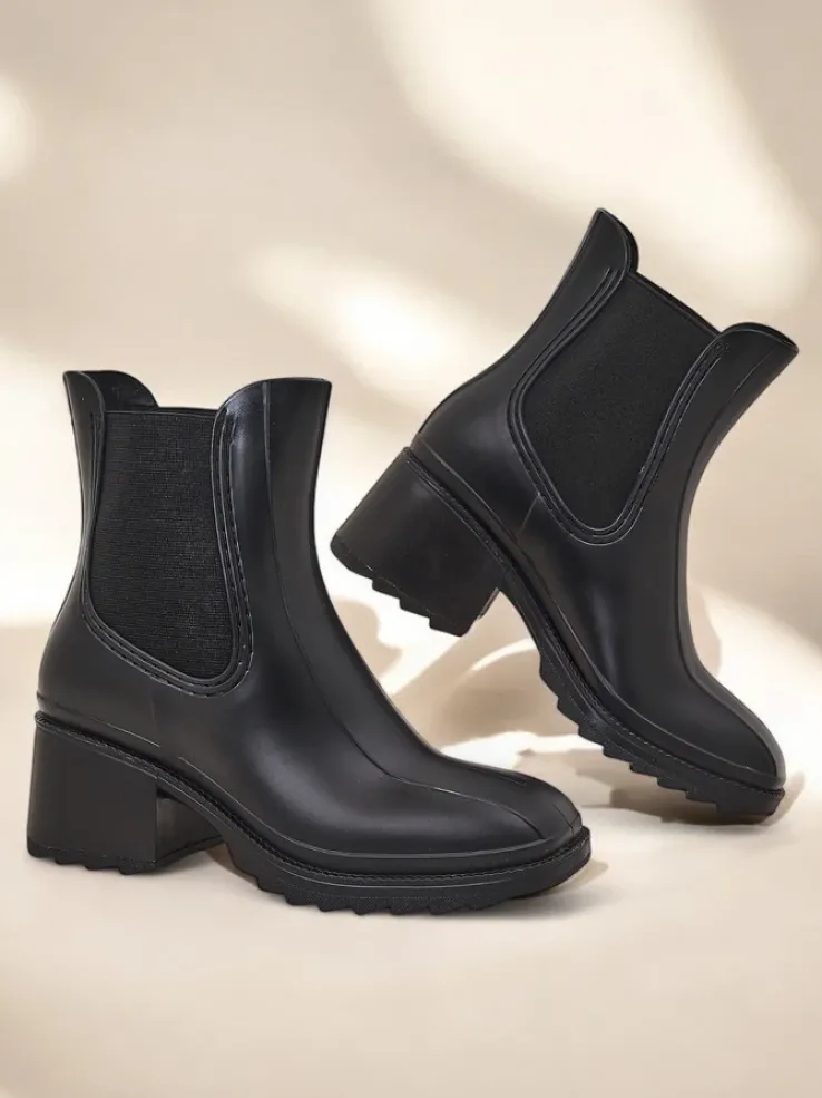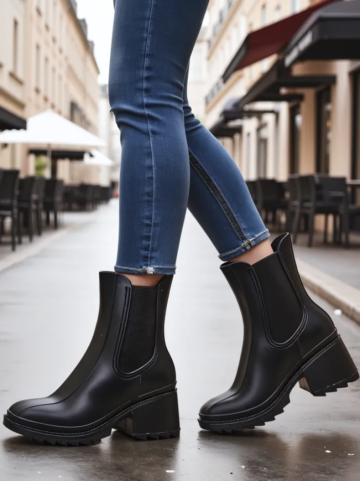 - Klasyczne, wsuwane damskie botki na płaskim obcasie, wykonane z materiału gumowego. W środku wkładka z tkaniny. Po bokach elastyczne wstawki. Idealne na jesienne deszczowe dni!