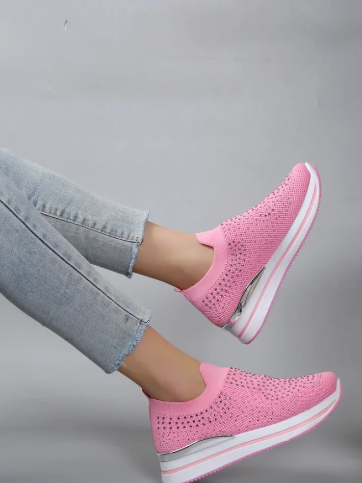 - Mega wygodne damskie wsuwane buty sportowe na płaskiej podeszwie. Cholewka jak i wkładka, wykonane z materiału tkaninowego zdobionego cyrkoniami. Idealne do sportowej odzieży na aktywnie spędzany czas!