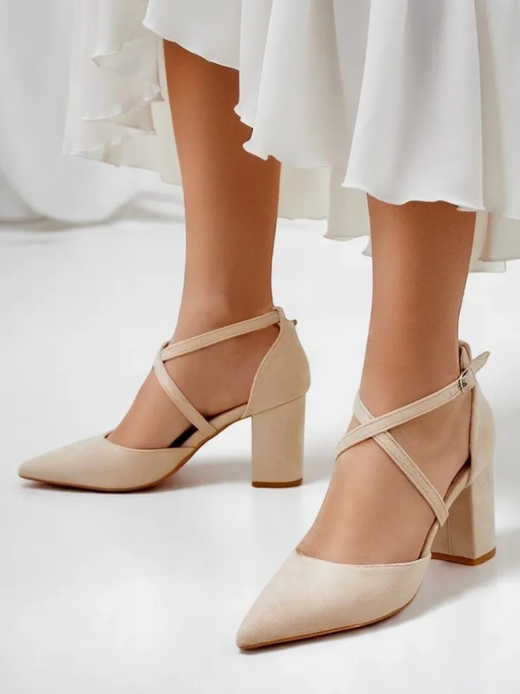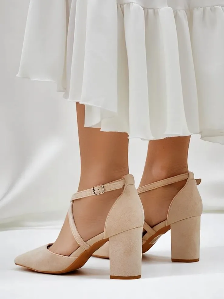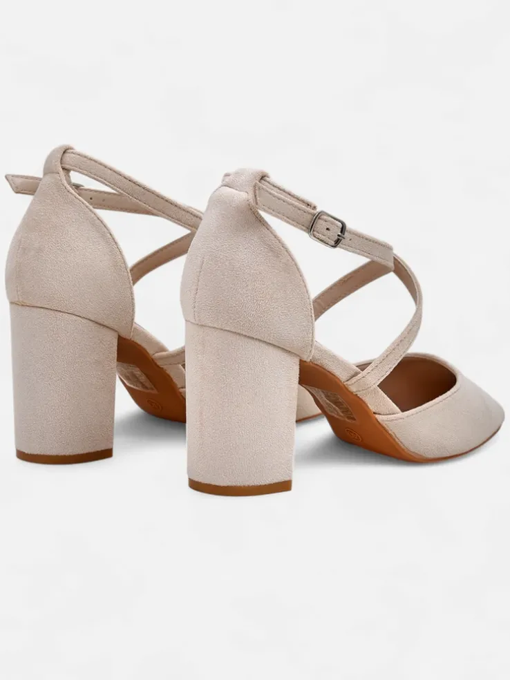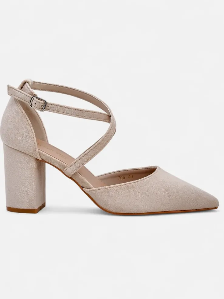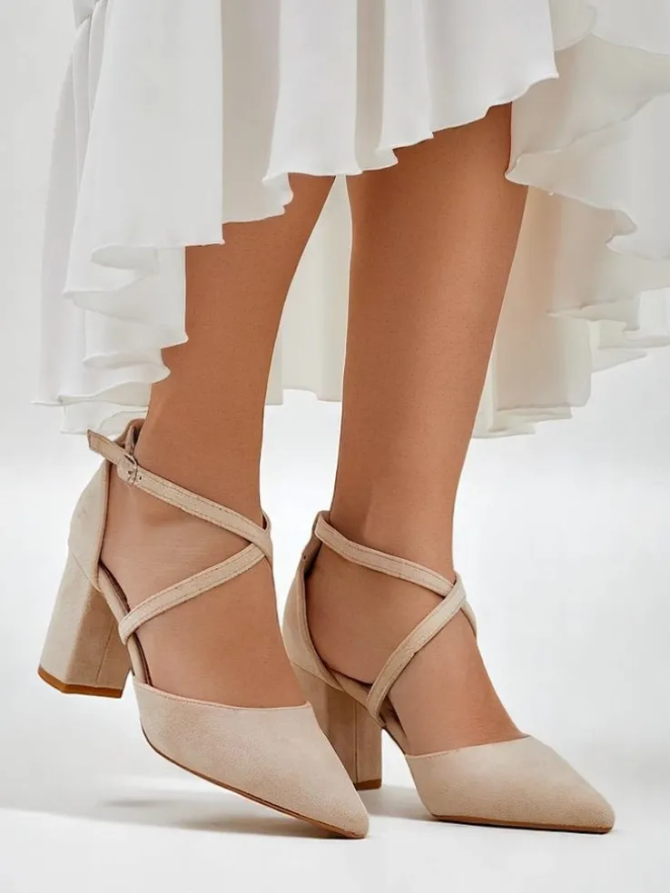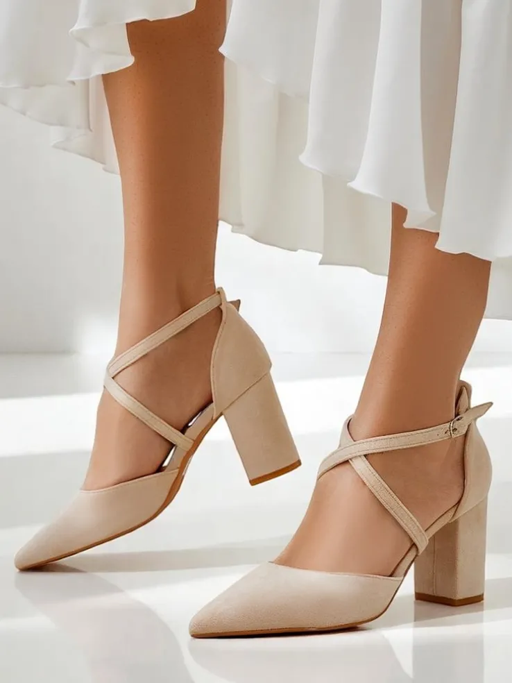 - Eleganckie damskie czółenka na słupku, wykonane ze skóry ekologicznej zamszowej. Środek buta jest wyłożony skórą ekologiczną, a nosek w szpic nadaje elegancji! Dodatkowo ozdobne paseczki!