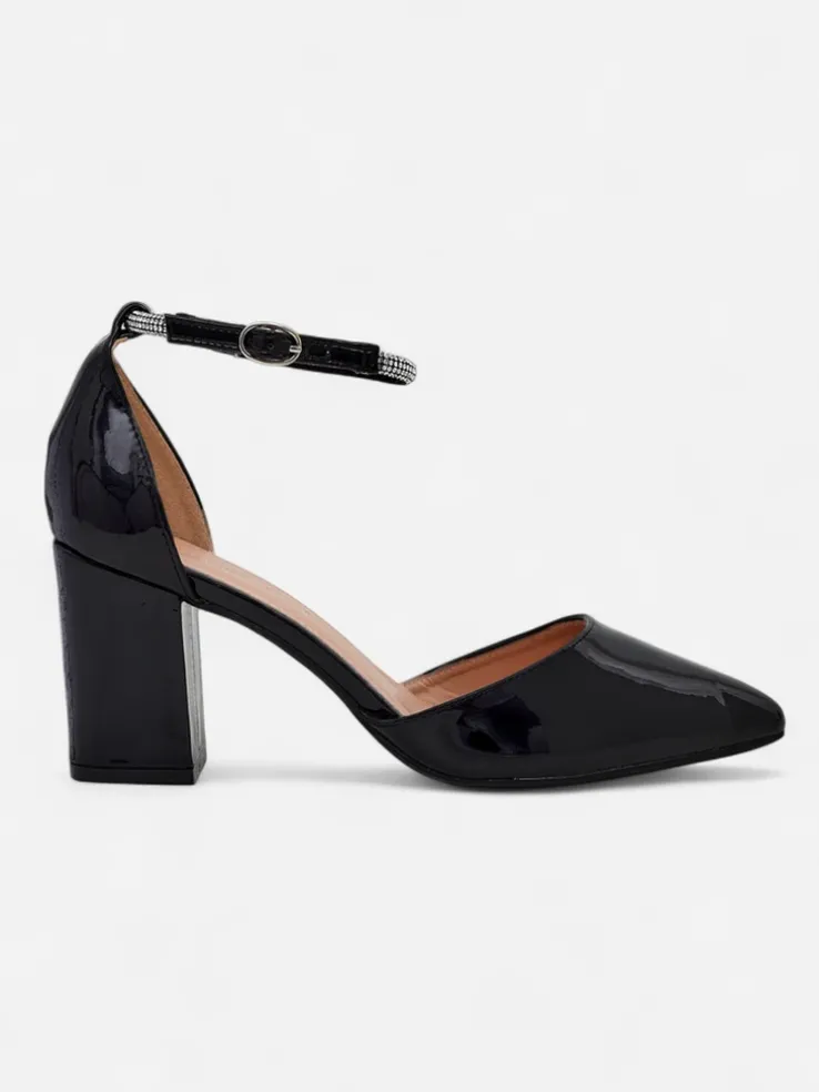 - Eleganckie damskie czółenka na słupku, wykonane ze skóry ekologicznej lakierowanej. Środek buta jest wyłożony skórą ekologiczną, a nosek w szpic nadaje elegancji! Dodatkowo ozdobny paseczek z cyrkoniami!