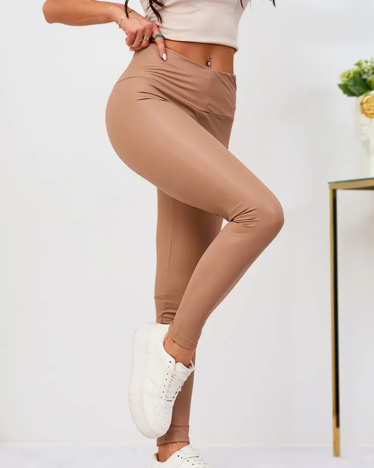 - Klasyczne ocieplane legginsy wykonane ze śliskiej tkaniny a’la skóra. Spodnie posiadają wysoki stan i szeroką gumę w pasie. Idealna baza do stylowych outfitów!