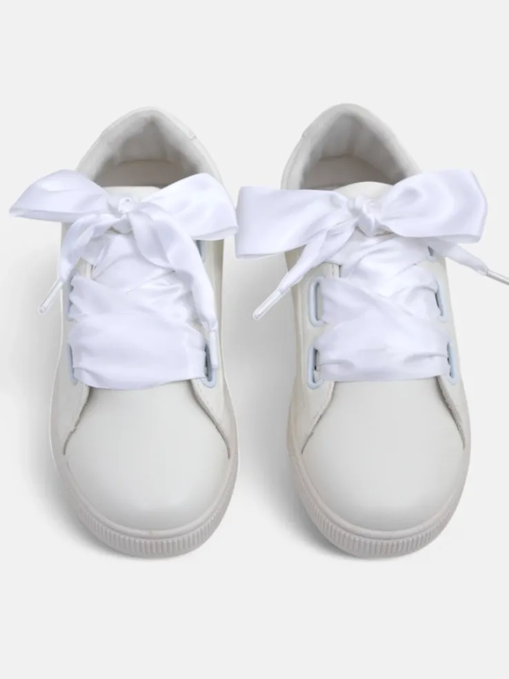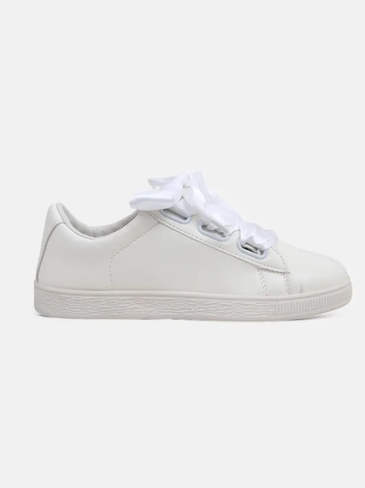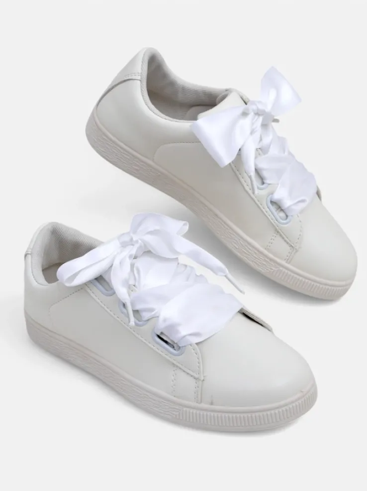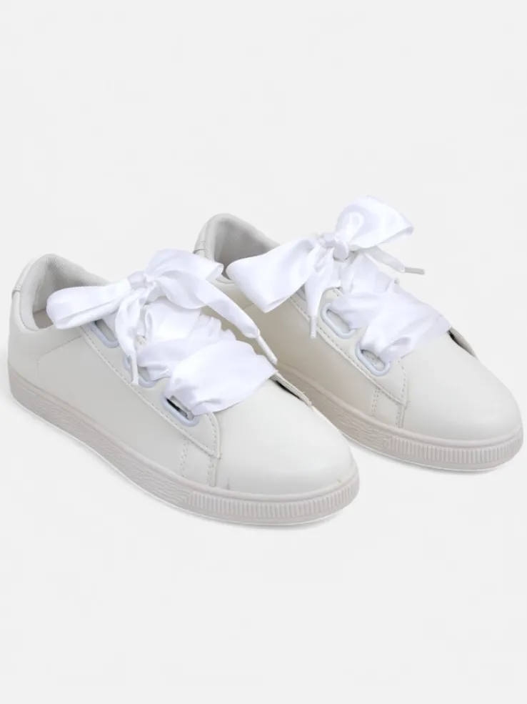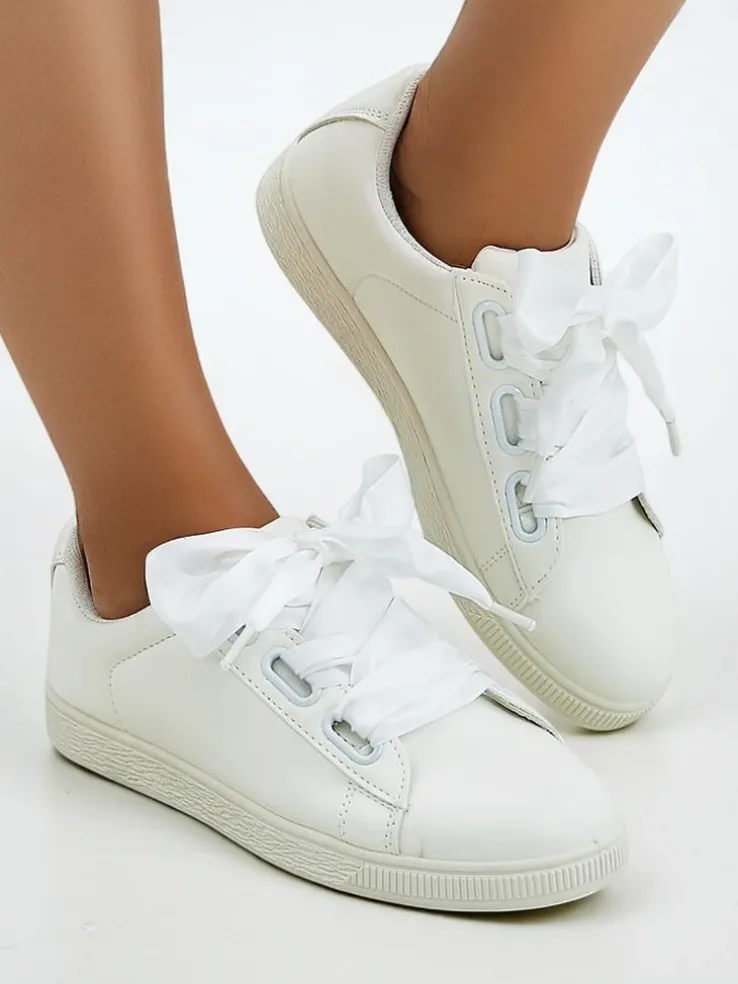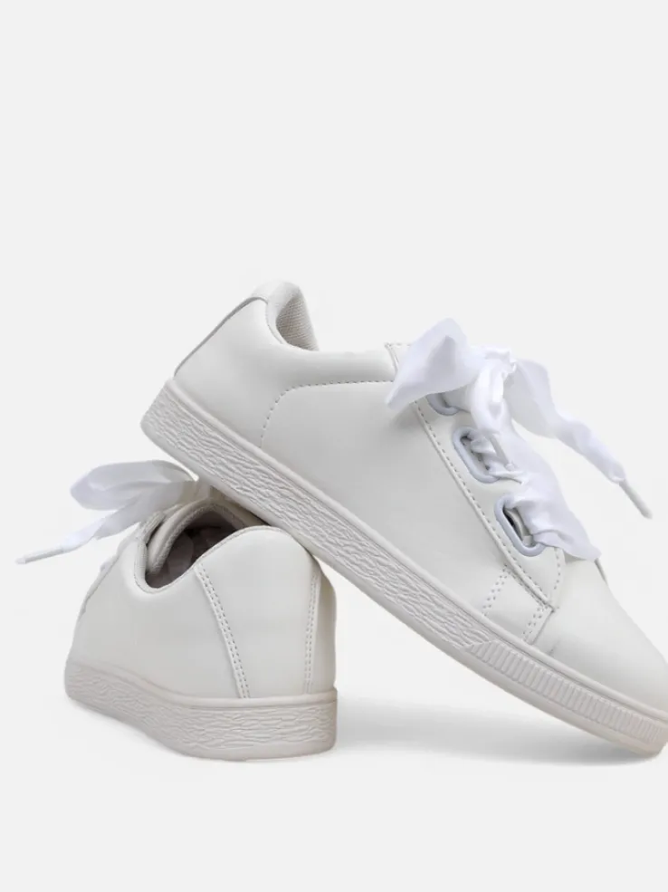 - Klasyczne trampki z eko skóry, wnętrze jest wyłożone tkaniną. Bardzo wygodne , sznurowane ozdobnymi wstążkami. Obuwie pasuje do wielu codziennych stylizacji!