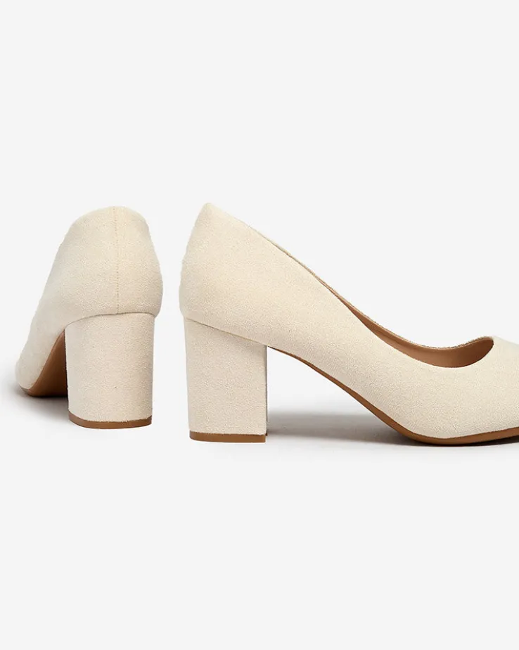 - Przepiękne damskie czółenka na słupku. Cholewka wykonana jest z zamszu ekologicznego, zaś środek wyłożony skórą ekologiczną, nosek okrągły. Must have Twojej szafy!