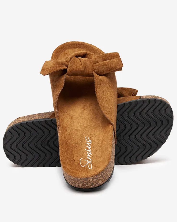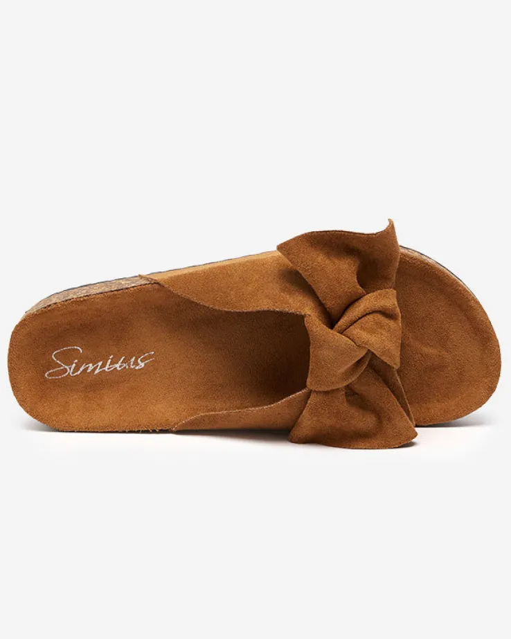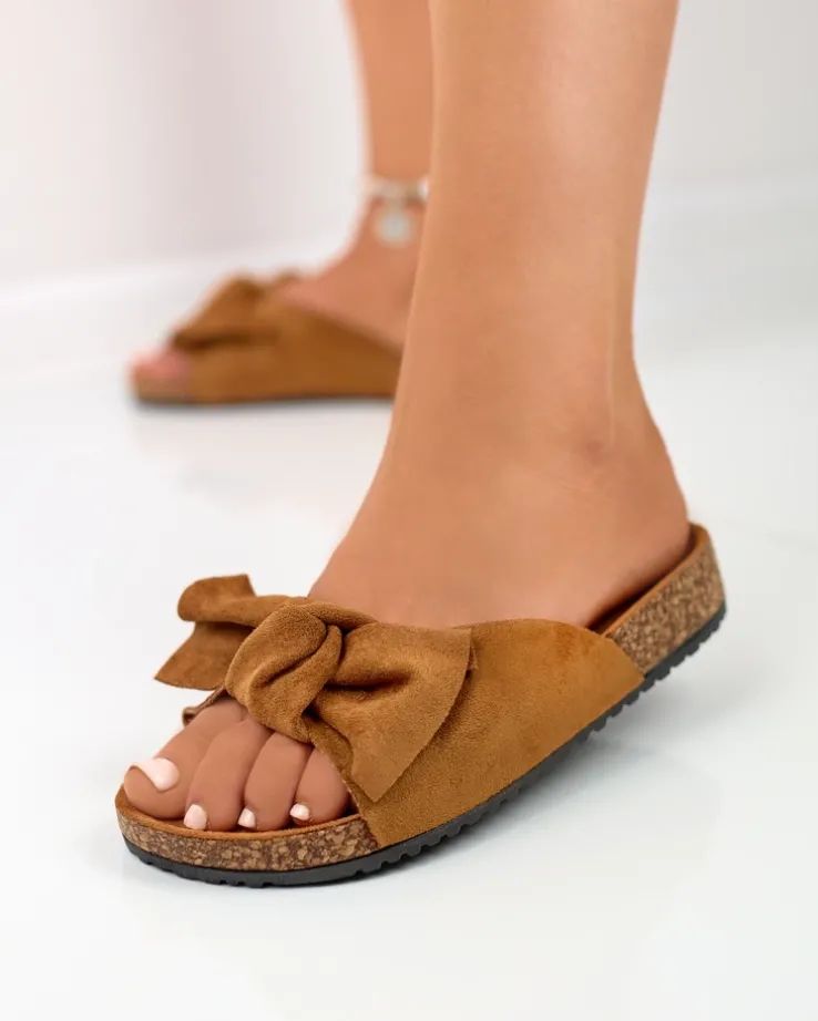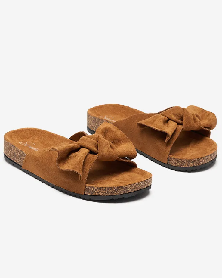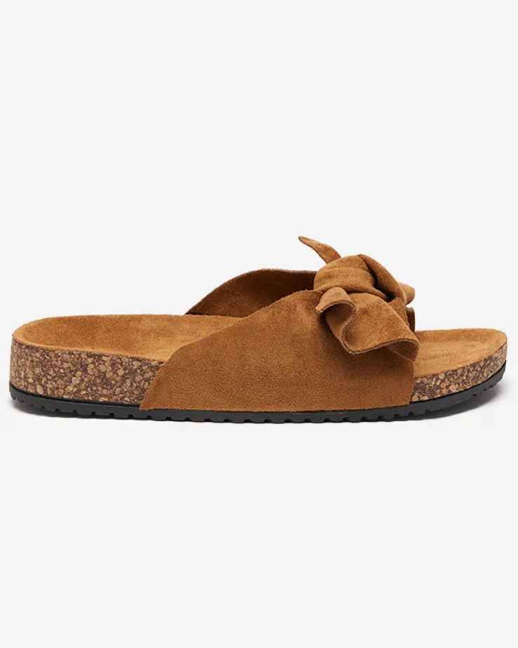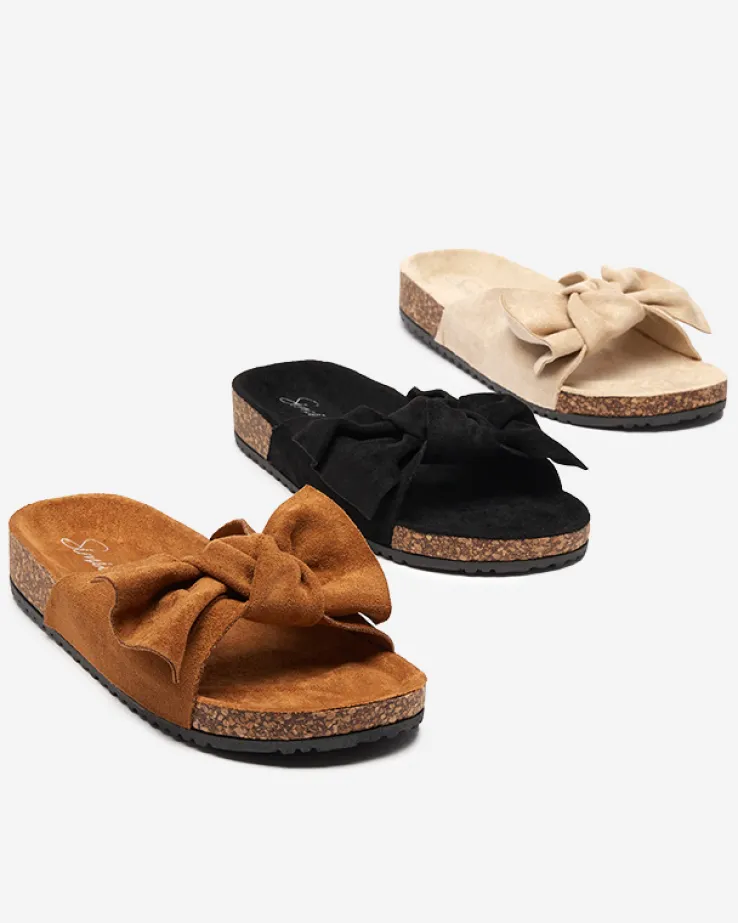 - Przepiękne klapki damskie ze skóry ekologicznej zamszowej, zdobione kokardą. Gumowa podeszwa zdobiona materiałem a’la korek. Idealnie uzupełnią letnie stylizacje!